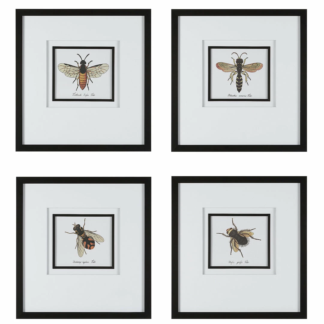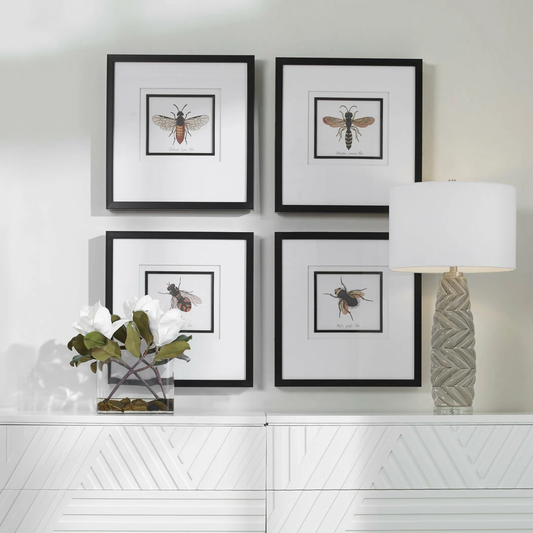 Inspired By Antique Scientific Bee Studies, This Artwork Exhibits Four Unique Species In Shades Of Black, Yellow, And Orange. Each Print Is Accented By Classic White Matting With A Slim Black Fillet And Matching Frame, All Under Glass.