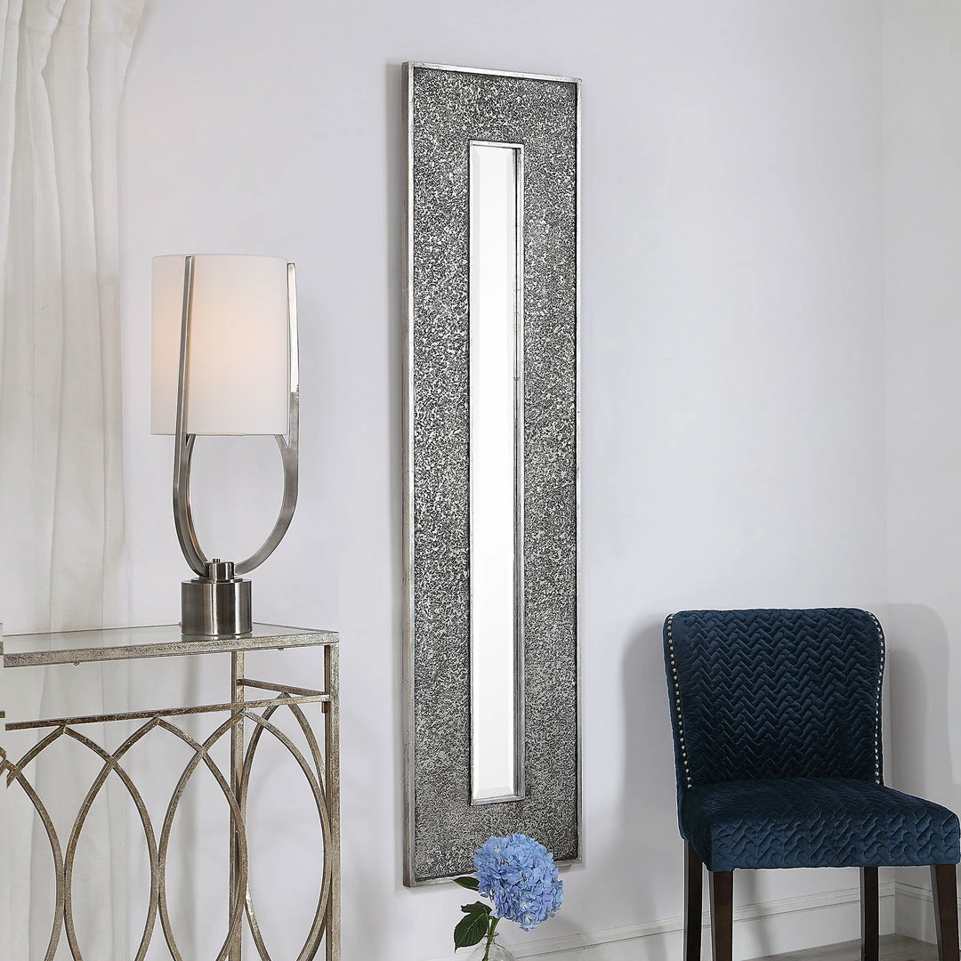This Rectangular Mirror Features A Heavily Textured Surface Finished In A Metallic Silver Leaf With A Heavy Charcoal Wash Over A Solid Wood Construction. This Contemporary Design Boasts A Great Profile For Showing Individually Or Multiple For A Bold Statement. The Mirror Is Beveled And May Be Hung Horizontal Or Vertical.