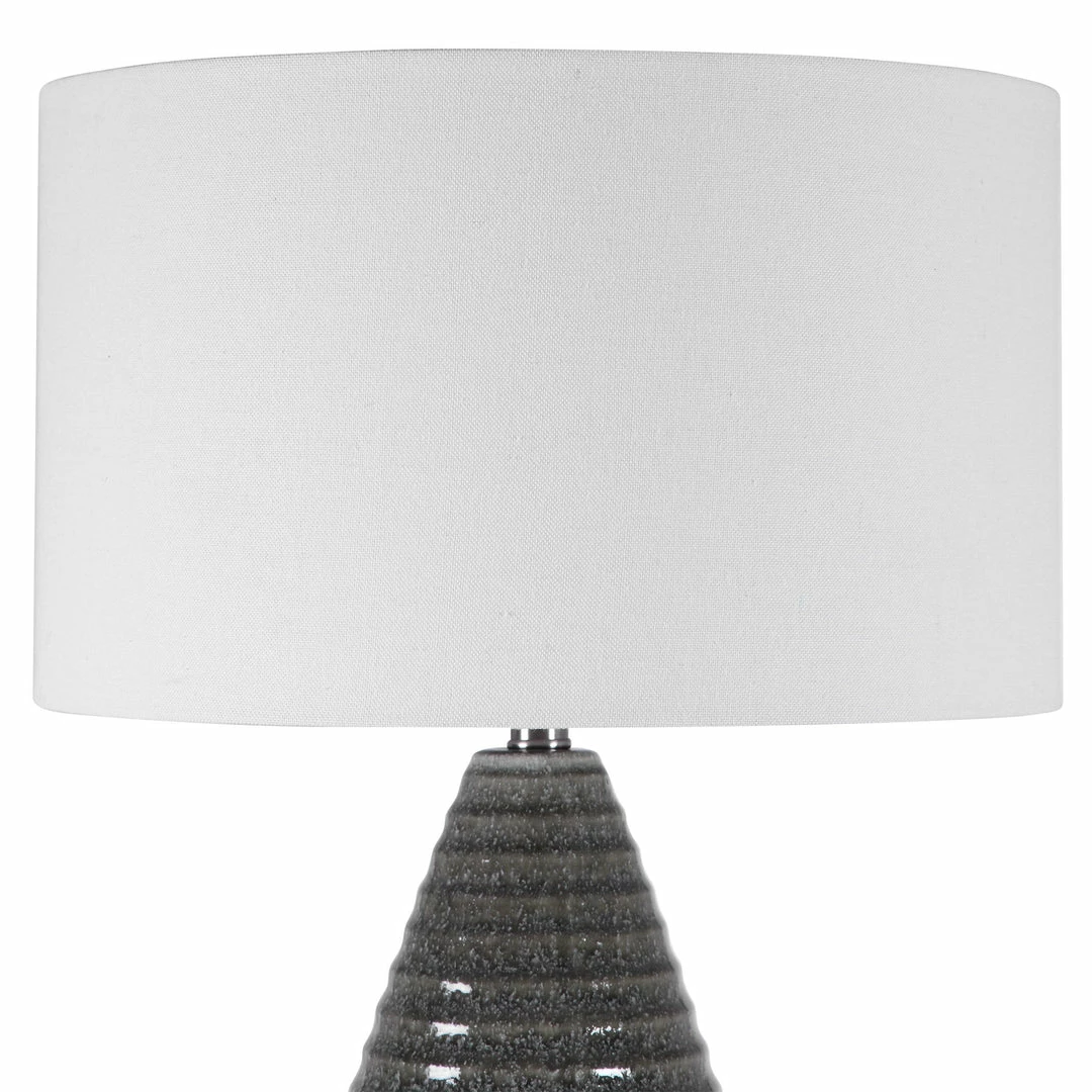 Showcasing A Tapered Ceramic Base With Ribbed Texture, This Transitional Table Lamp Is Finished In A Smoke Gray Crackle Glaze With A Thick Crystal Foot And Brushed Nickel Accents. The Lamp Is Accented By A White Linen Drum Shade With Light Slubbing.