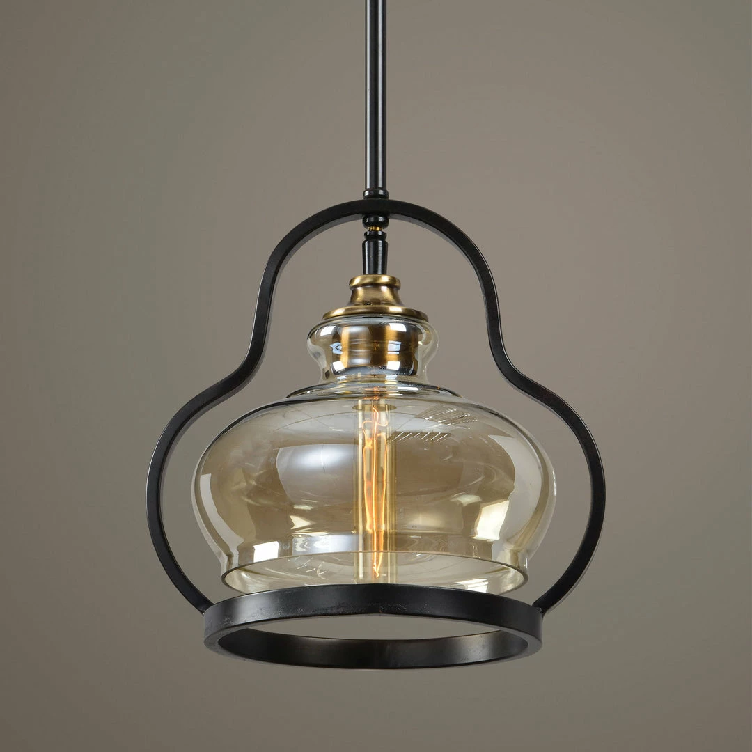Updated Mini Pendant With Curvaceous Accent Tubing That Follows The Contour Of The Light Amber Glass Shade. Rod Hung In An Aged Black Iron Finish With Antiqued Brass Plated Details. Includes 1-40 Watt T30 Clear Antique Style Bulb. Supplied With 15′ Wire, 3-12″ Stems And 1-6″ Stem For Adjustable Installation.