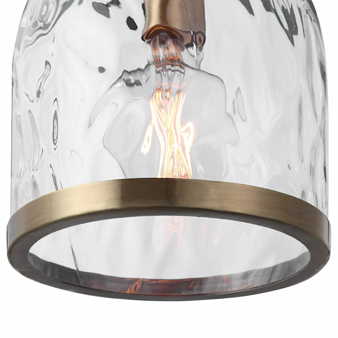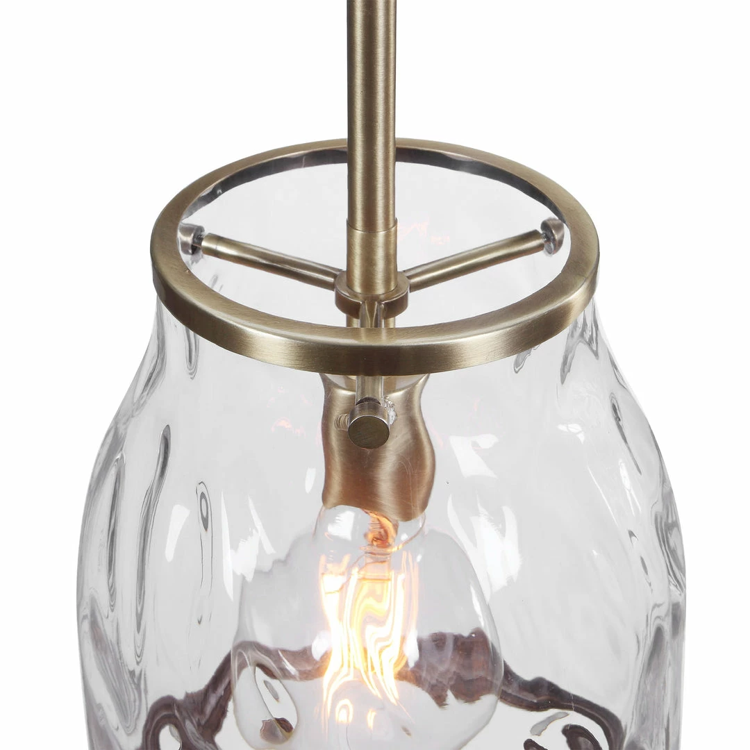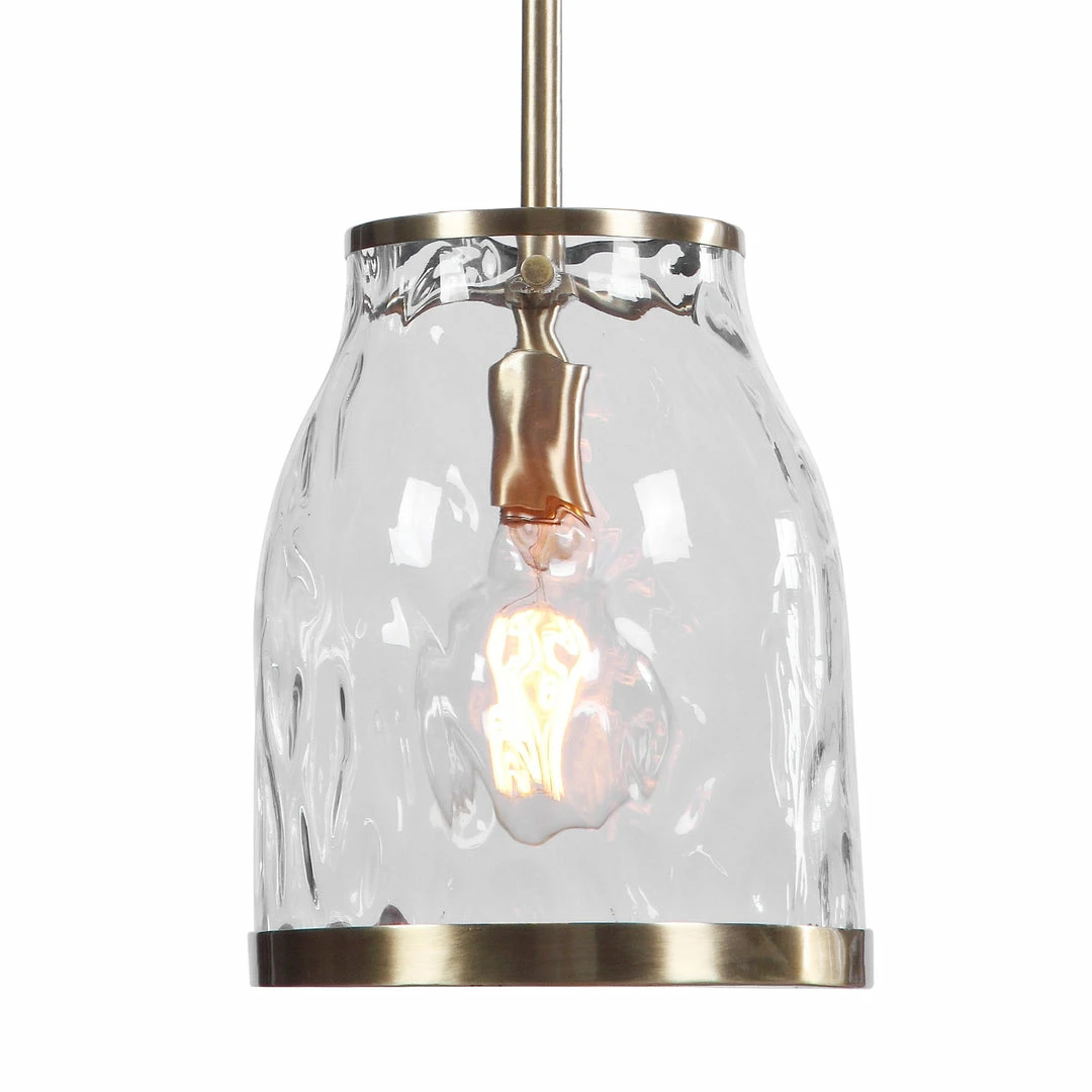 With An Interesting Bell Shape In Clear Watered Glass Our 1 Lt. Mini Pendant Offers Updated Charm With A Nod To Traditional Looks. The Antique Brass Finish Stands Out On The Rich Lower Ring Finishing The Glass Edge. With 1-60 Watt Max, Edison Socket And Includes 1-40 Watt Clear G95 Antique Style Bulb. Supplied With 15′ Wire, 3-12″ Stems And 1-6″ Stem For Adjustable Installation.