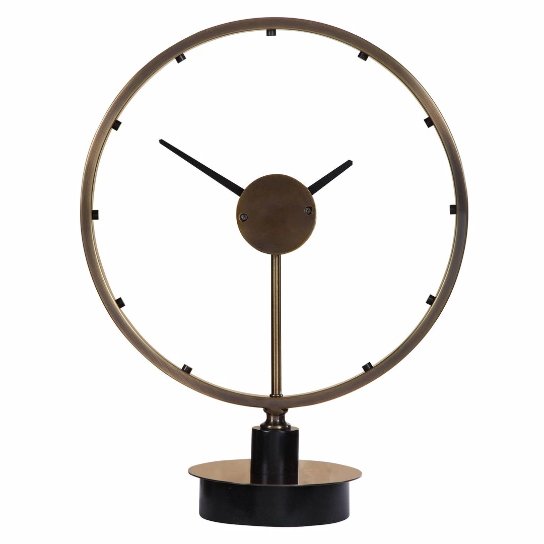 Modern Table Clock Features A Steel Construction, Finished In Antique Brushed Brass With Aged Black Accents. Quartz Movement Ensures Accurate Timekeeping. Requires One “AA” Battery.