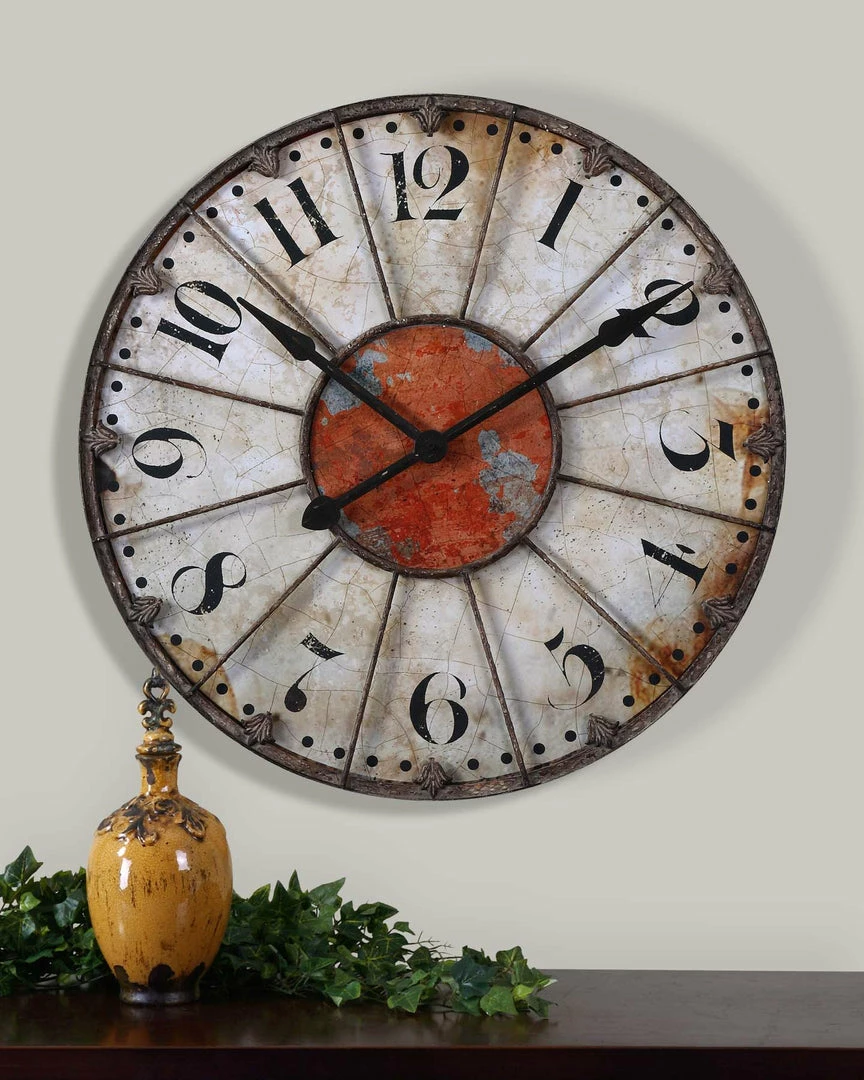 Wall Clock Featuring A Crackled Ivory Face With Rust Red Accent And Rustic Bronze Metal Details. Quartz Movement Ensures Accurate Timekeeping. Requires One “AA” Battery.