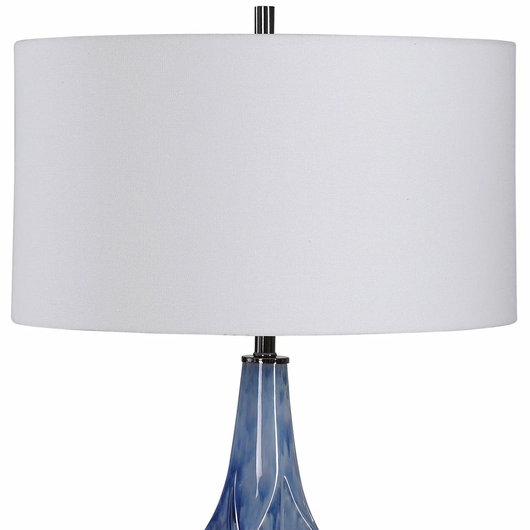 This Ceramic Table Lamp Is Finished In A Beautiful Reactive Indigo Blue Glaze, Accented By Elegant, Polished Nickel And Crystal Details. A White Linen Fabric Drum Shade Completes The Look.