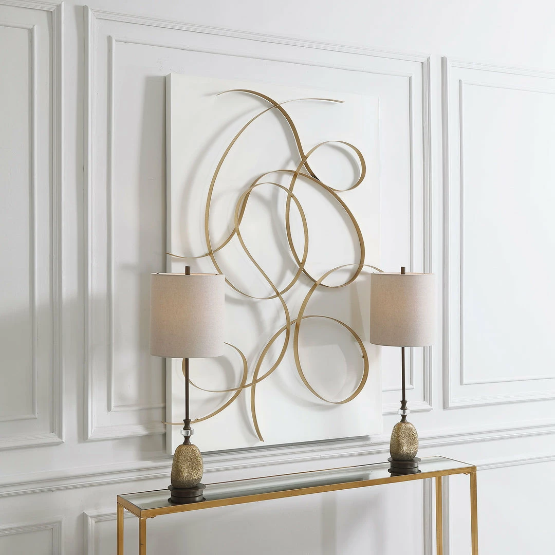 A Feminine Take On Abstract Contemporary Styling, Featuring A Solid Iron Construction. The Matte White Base Is Accented By A Free-flowing Hand Forged Metal Design In A Classic Brushed Gold Finish. May Be Hung Horizontal Or Vertical.