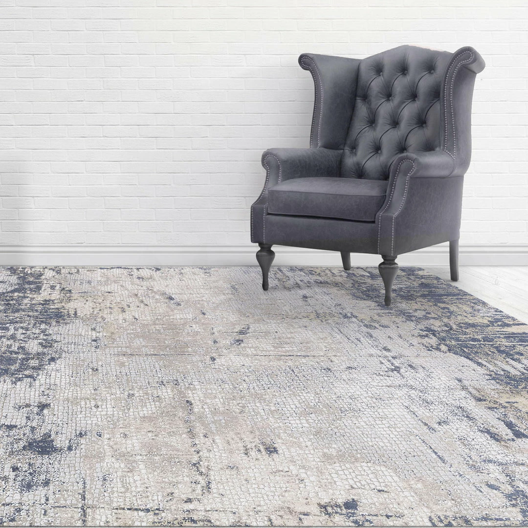 This Power Loomed Rug Features An Abstract Design In Tones Of Beige And Light Gray, With Indigo Blue Detailing, Constructed From A Mix Of Polyester And Viscose For A Soft To The Touch Feel.