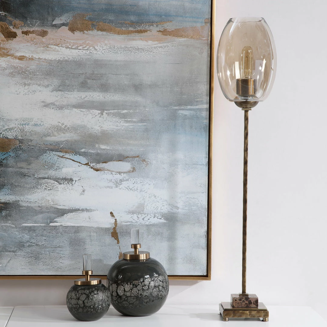 This Buffet Lamp Features A Solid Iron Base Finished In Antique Brushed Brass With A Hammered Texture. The Piece Is Accented By Brown Marble And Is Paired With An Amber Glass Hurricane. One 60-watt T-10, Edison Bulb Is Included.