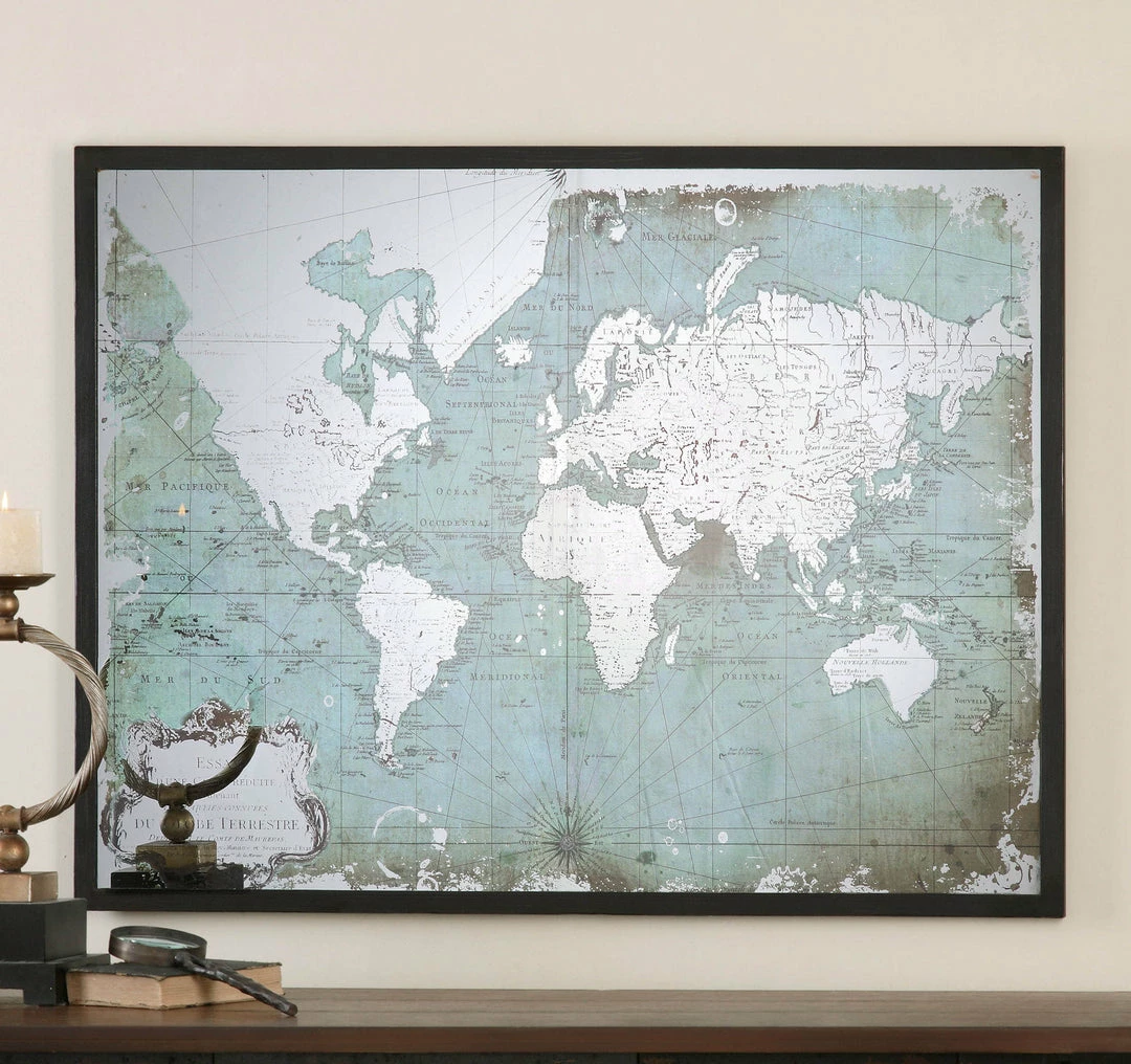 Classic, Old-world Style Is Evoked In This Beautifully Unique Artwork. This Piece Is Created By Printing The Map Image On The Back Of A Mirror. Shades Of Charcoal, Sepia And Sea Foam Green Are Used To Create This Work. A Simple Black Metal Frame Completes This Piece. Artwork By Eastown.