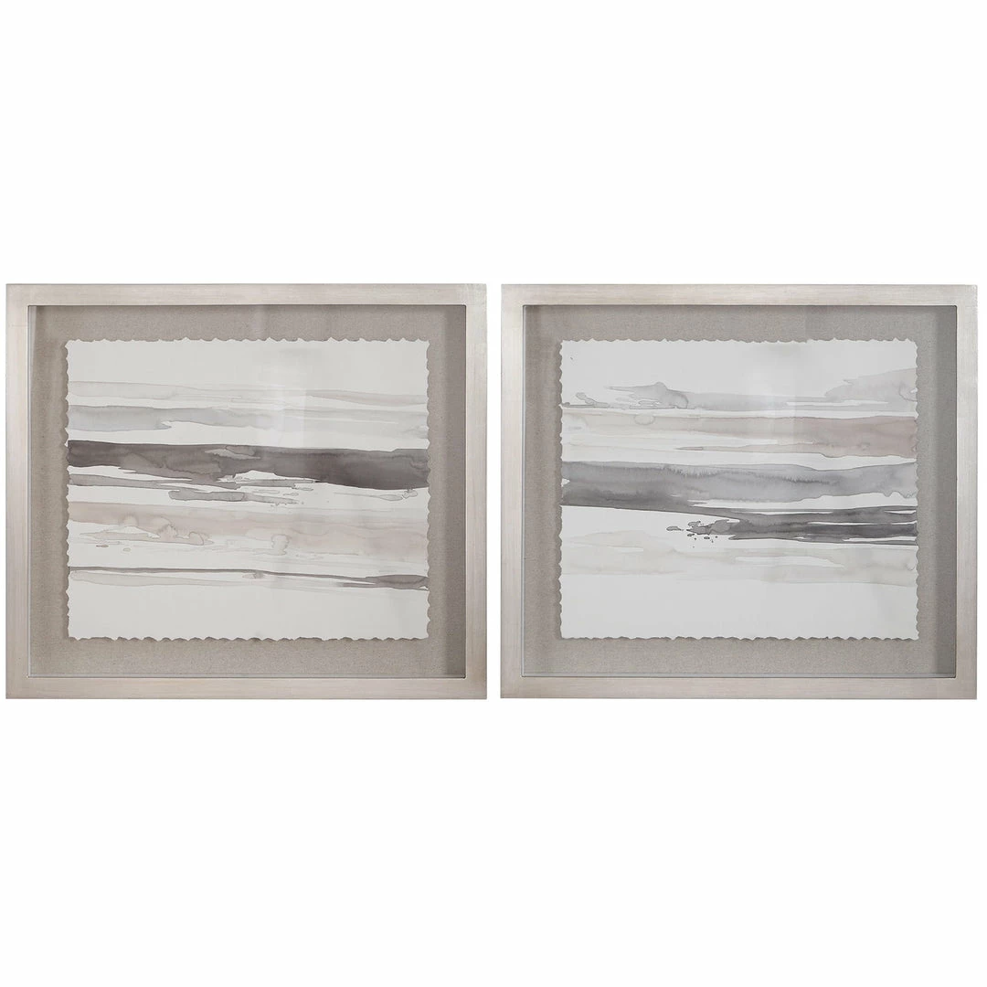 These Abstract Watercolors Add Transitional Style To A Space. Each Piece Features Light Gray, Charcoal, And White Hues On Deckled Parchment, Set Against An Oatmeal Linen Background. Each Original Watercolor Is Placed In A Champagne Silver Shadow Box Frame Under Protective Glass. This Artwork May Be Hung Horizontal Or Vertical.