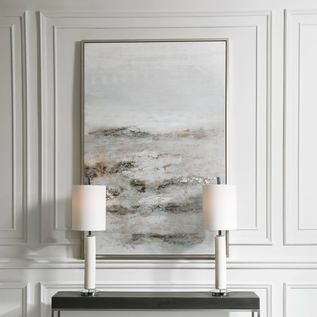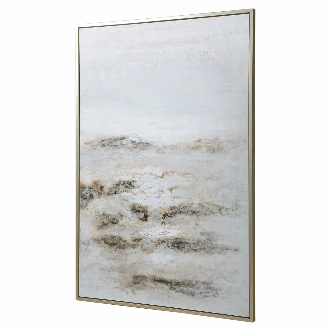 A Fresh Take On Abstract Paintings, This Hand Painted Artwork Showcases A Neutral Color Palette With Brown, Taupe And White Tones Accented By Pops Of Light Blue. The Artwork Is Complemented By A Silver Gallery Frame. Due To The Handcrafted Nature Of This Artwork, Each Piece May Have Subtle Differences.