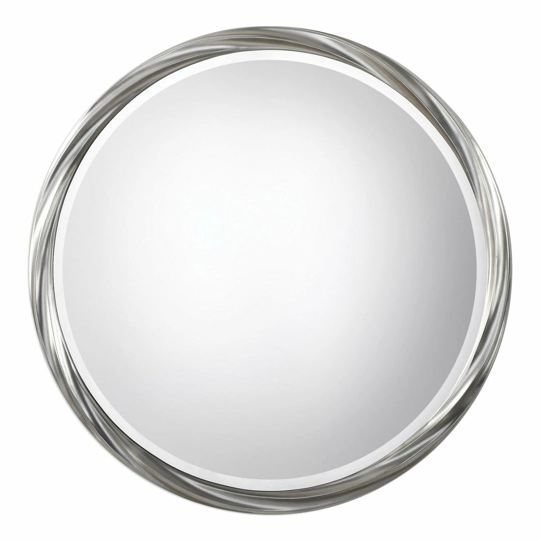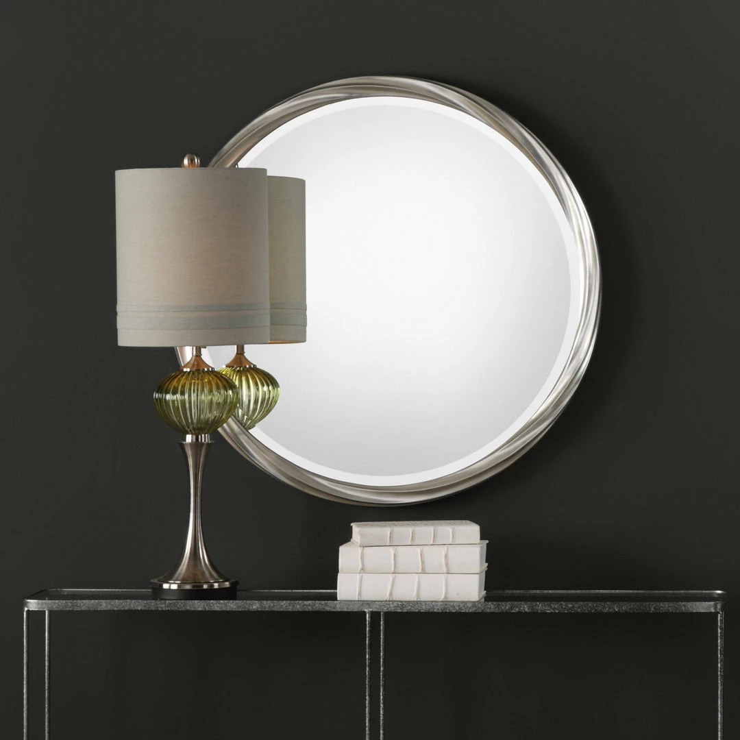 This Contemporary Design Features A Twisted Motif With A Hand Applied Metallic Silver Leaf Finish. Mirror Has A Generous 1 1/4″ Bevel.