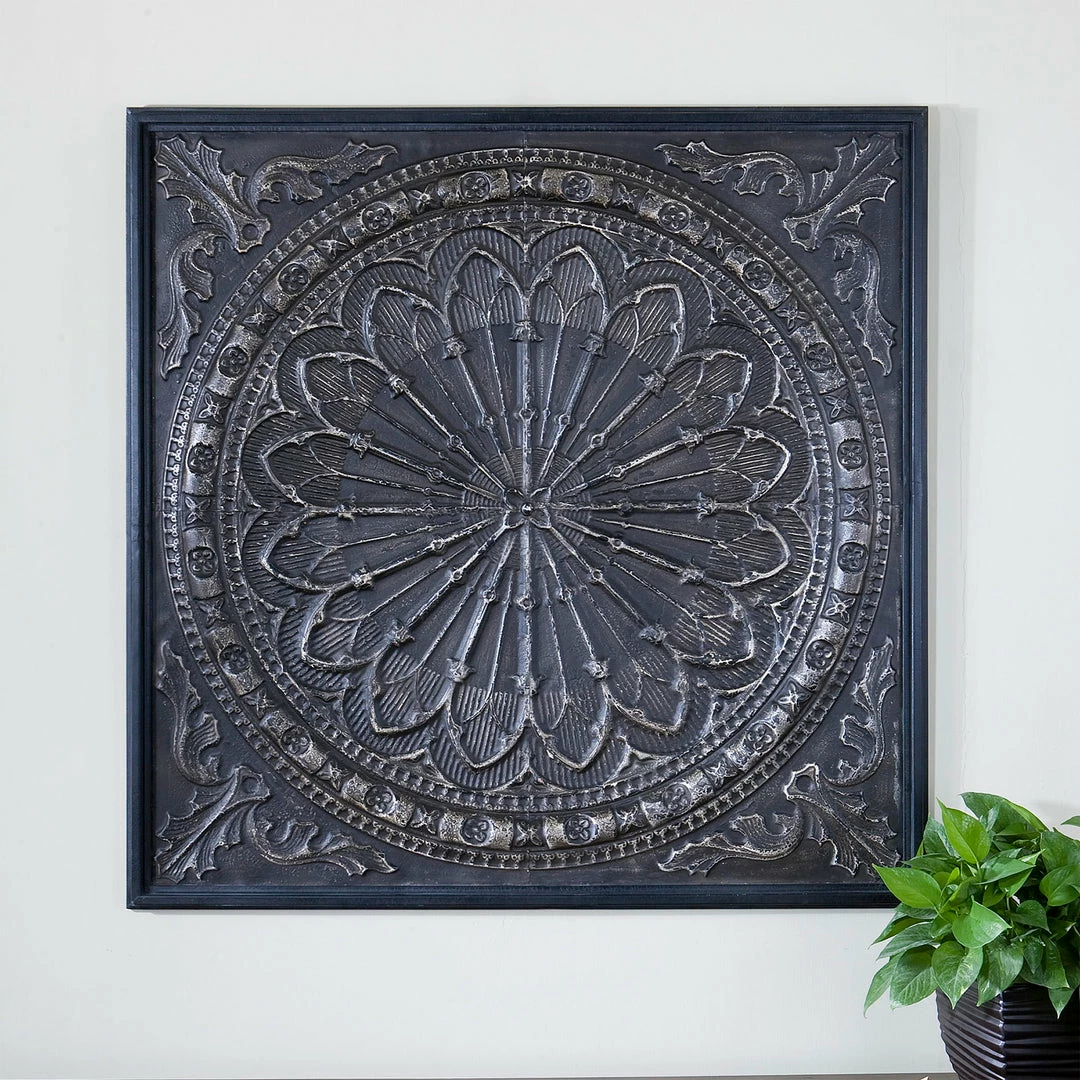 Ornate Wall Decor Made Of Embossed Iron Finished With A Lightly Antiqued, Chocolate Brown Glaze Accented By A Narrow, Black Crackled Frame.