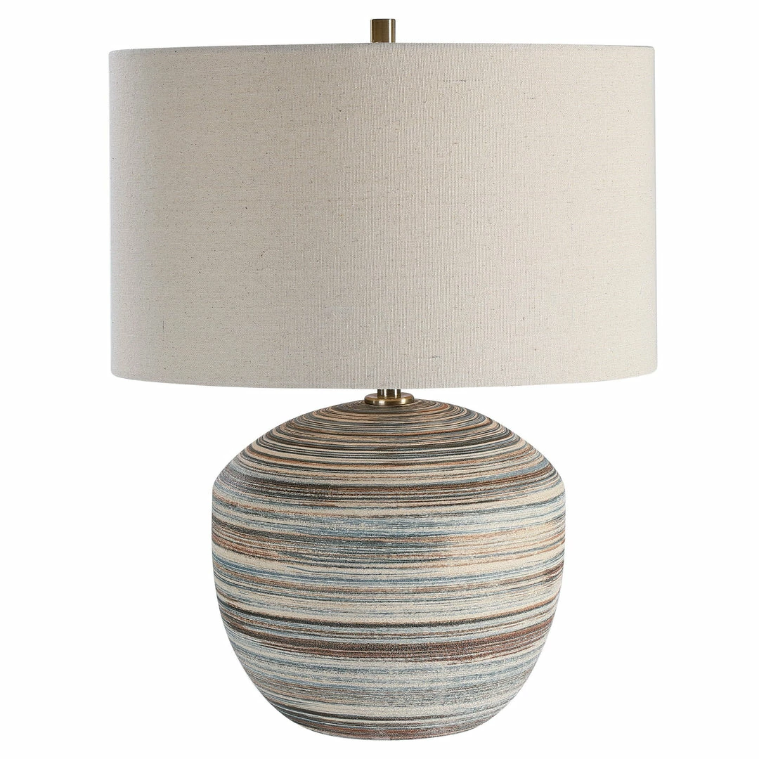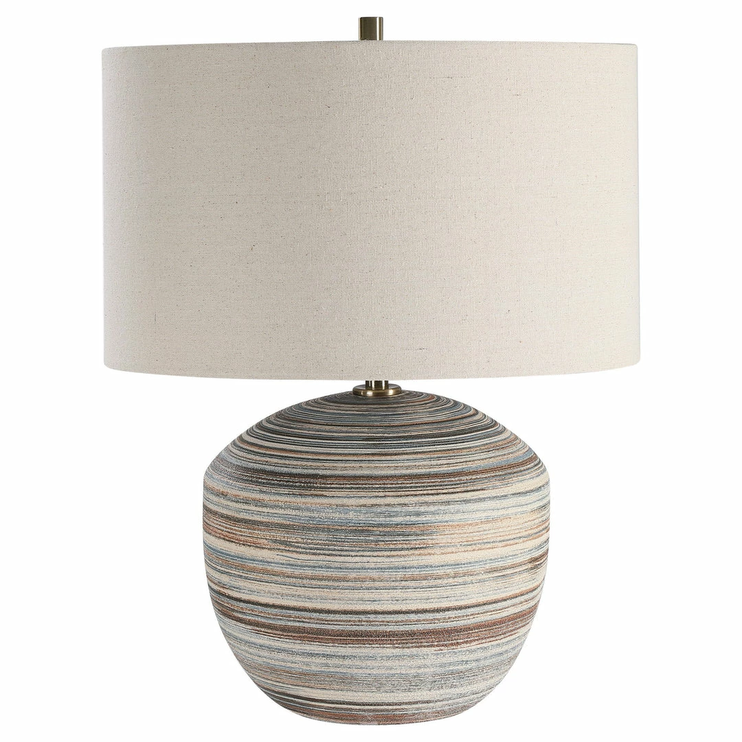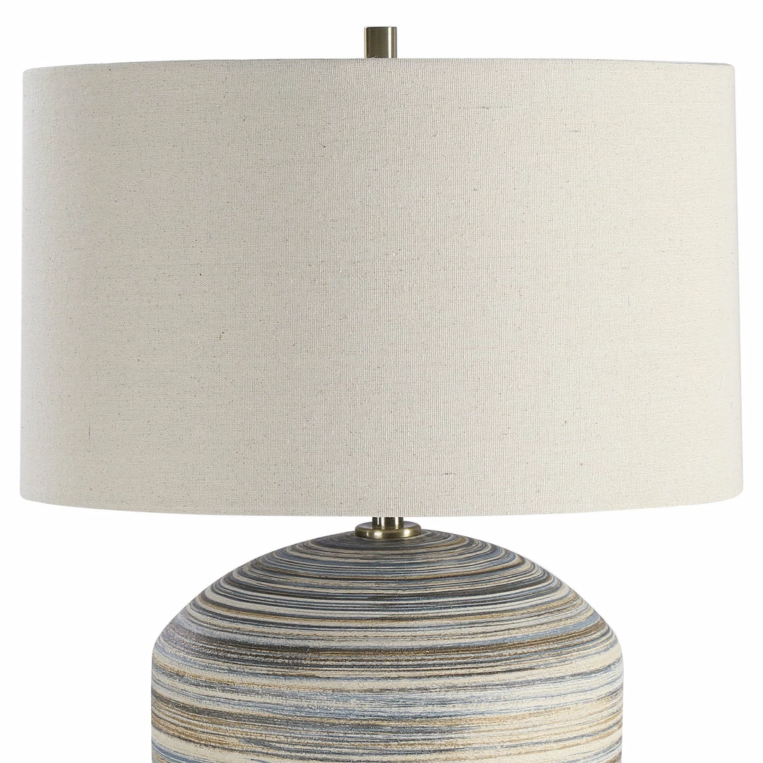 This Ceramic Accent Lamp Features A Striped Motif In Neutral Shades Of Brown, Taupe, Cream And Blue Accented By Light Brushed Brass Plated Details. A Light Beige Linen Drum Shade With Natural Slubbing Completes The Piece.