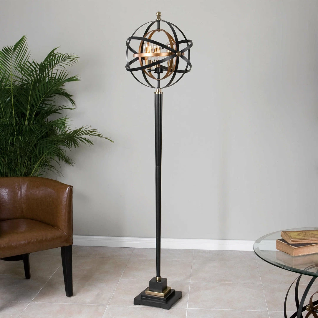Metal Armillary Sphere Finished In A Dark Oil Rubbed Bronze And French Gold Leaf Sitting On Top Of A Sleek Tapered Base. Three 60-watt BT58, Antique Style Bulbs Included.