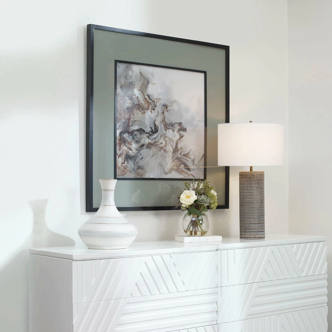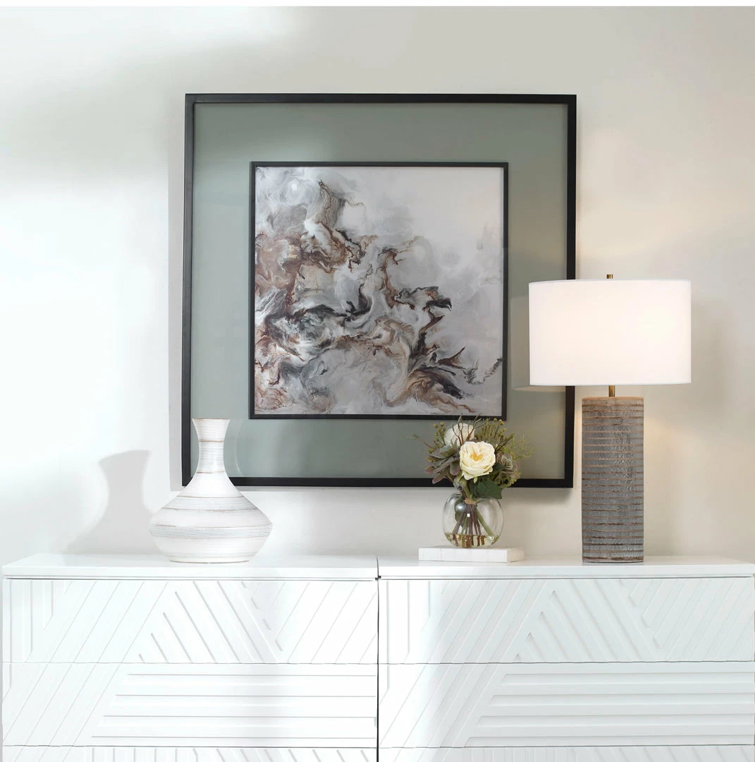 This Framed Abstract Print Exudes Modern Style. Smooth, Marbled Neutrals Are Paired Together In This Versatile Artwork. A Masculine Style Is Added With A Gray Faux Leather Mat With Green Undertones. A Wooden Frame Finished In Black Satin And A Matching Fillet Complete This Artwork. This Print Is Placed Under Protective Glass. Artwork By Corrie Lavelle.