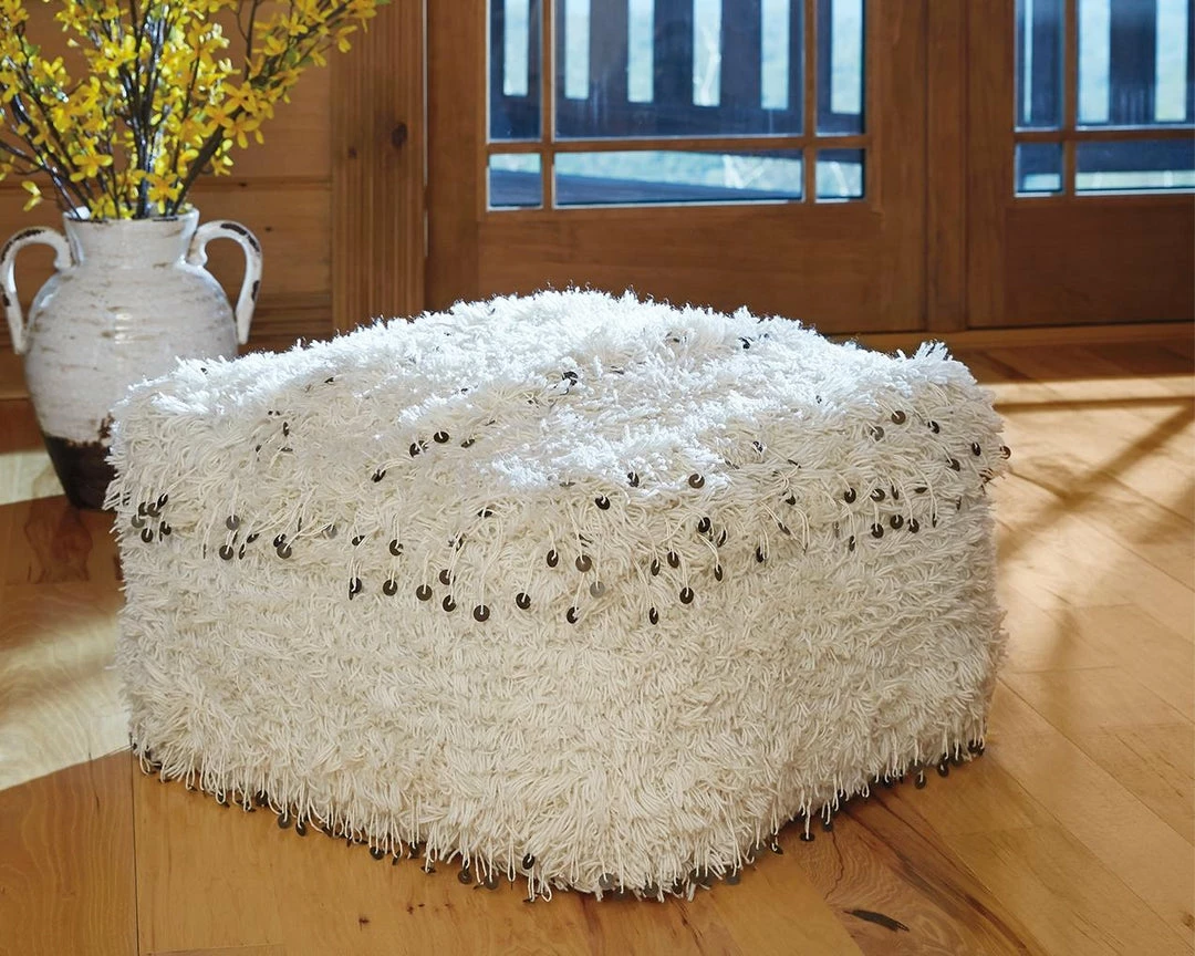 Soft, shaggy and shiny. This pouf is a glamourous throwback with a creamy woven cover, tastefully embellished with sequin accents for a luxe bohemian style. It’s a perfect perch for friends or for kicking up your feet at the end of a long day.
