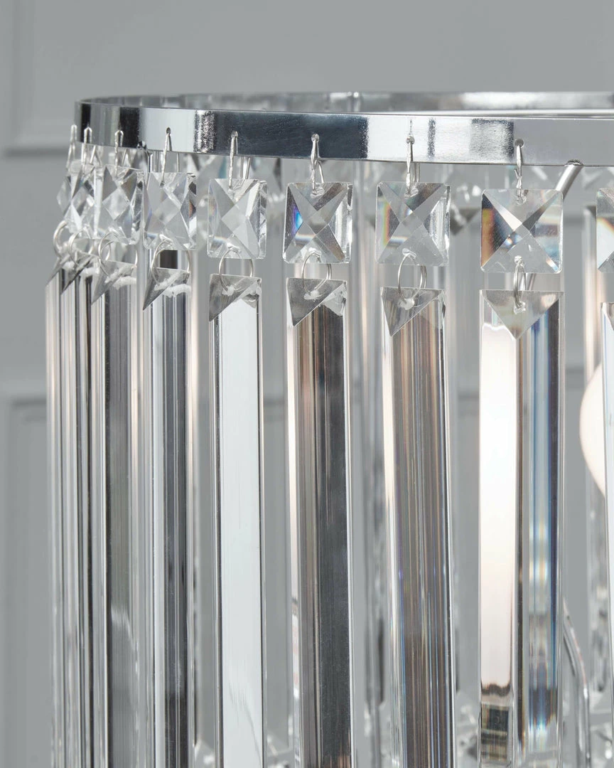 Add glamour and bling to your life with this slim-bodied metal table lamp. A chic addition to modern and contemporary aesthetics, it showcases a polished chrome-tone finish, a round base, and a showstopping crystal-beaded drum shade that casts a radiant display when lit.
