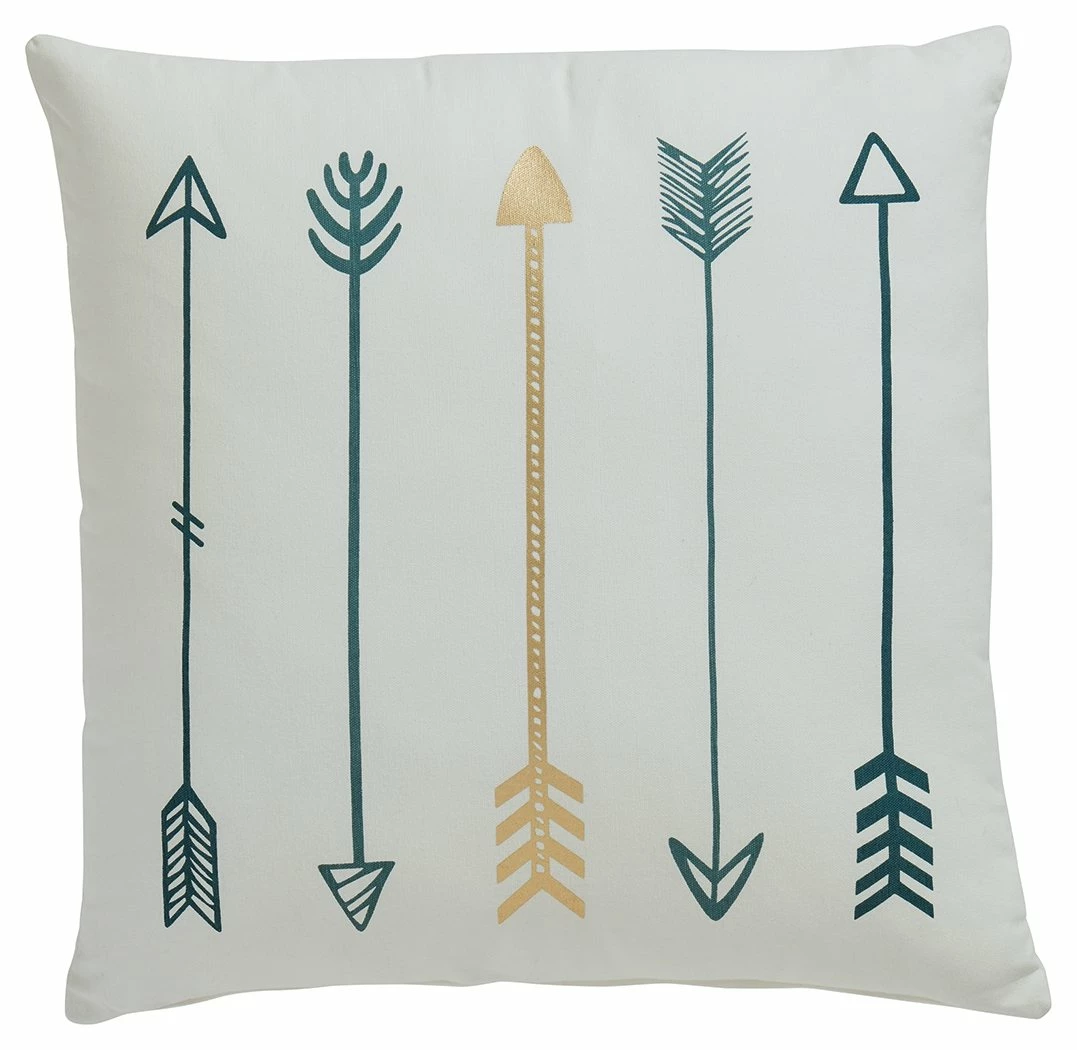 Add a distinctive piece of decor to your room with this accent pillow. Adorned with a pattern of arrows in teal, white and metallic goldtone, this striking print adds a splash of style to any decor. Featuring a cotton cover with knife edge construction and zipper closure, this pillow is perfect for use on a bed or chair to freshen up your living space in a beautiful way.