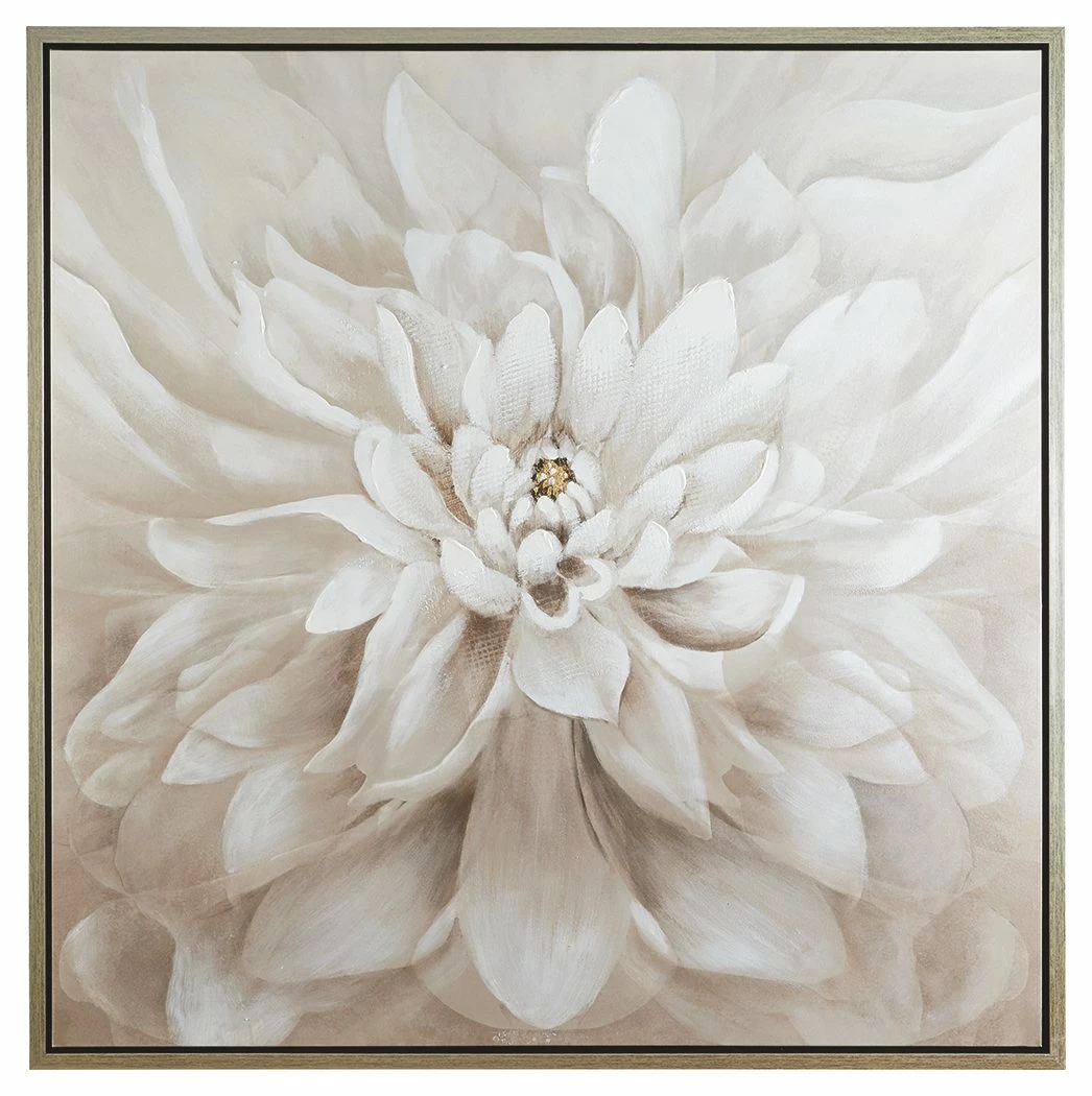 Bring serenity to your modern paradise with this wall art. Unfurled tight pedals full of enchanting beauty depicted in this flower portrait provide a soothing backdrop in any decor, especially a modern decor. The flower is in shades of taupe and white and has gold leaf embellishment—quite pretty for adding a touch of nature to any room.