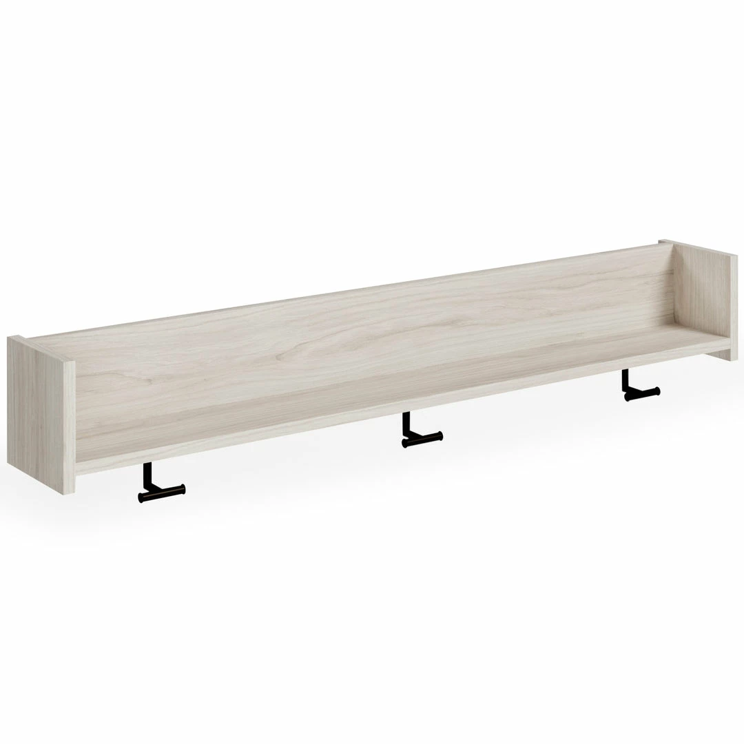 The sleek, minimalist look of this wall-mounted coat rack is fashionably contemporary and easy to integrate in a variety of living spaces. Three sturdy hooks and a spacious shelf are your new go-to spot for hats and scarves or displays. Whether by the front door or back entry, this coat rack keeps all-weather essentials well within reach.