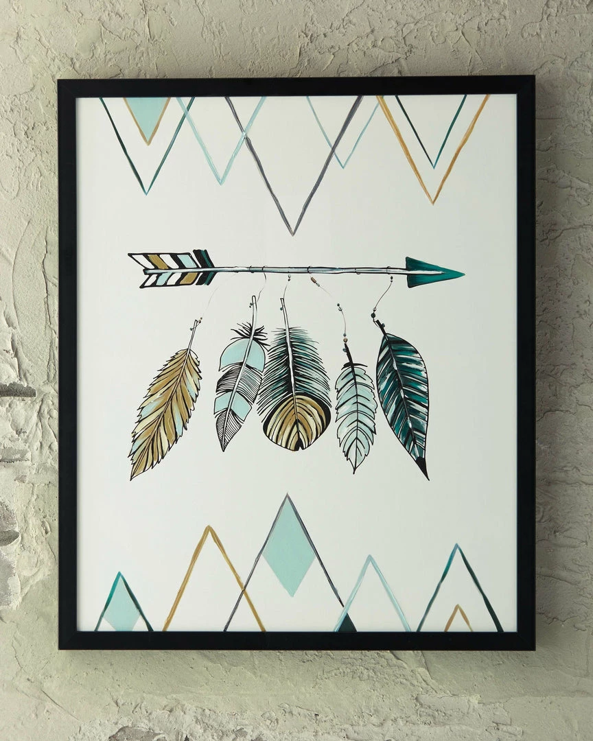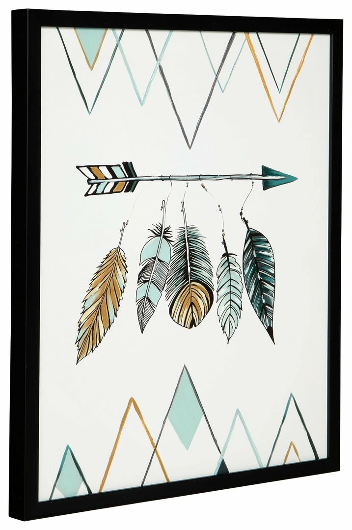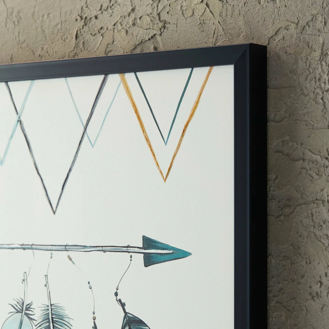 Add a pop of pattern and color with this eye-catching, hand painted embellished feather and arrow design. This wall art features dynamic colors in teal, gray and gold. Framed in gallery wrapped canvas, this wall art is sure to make a statement.