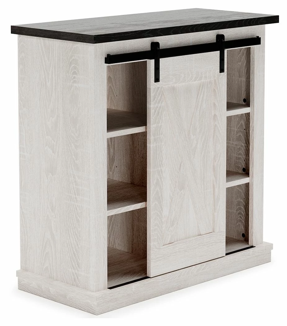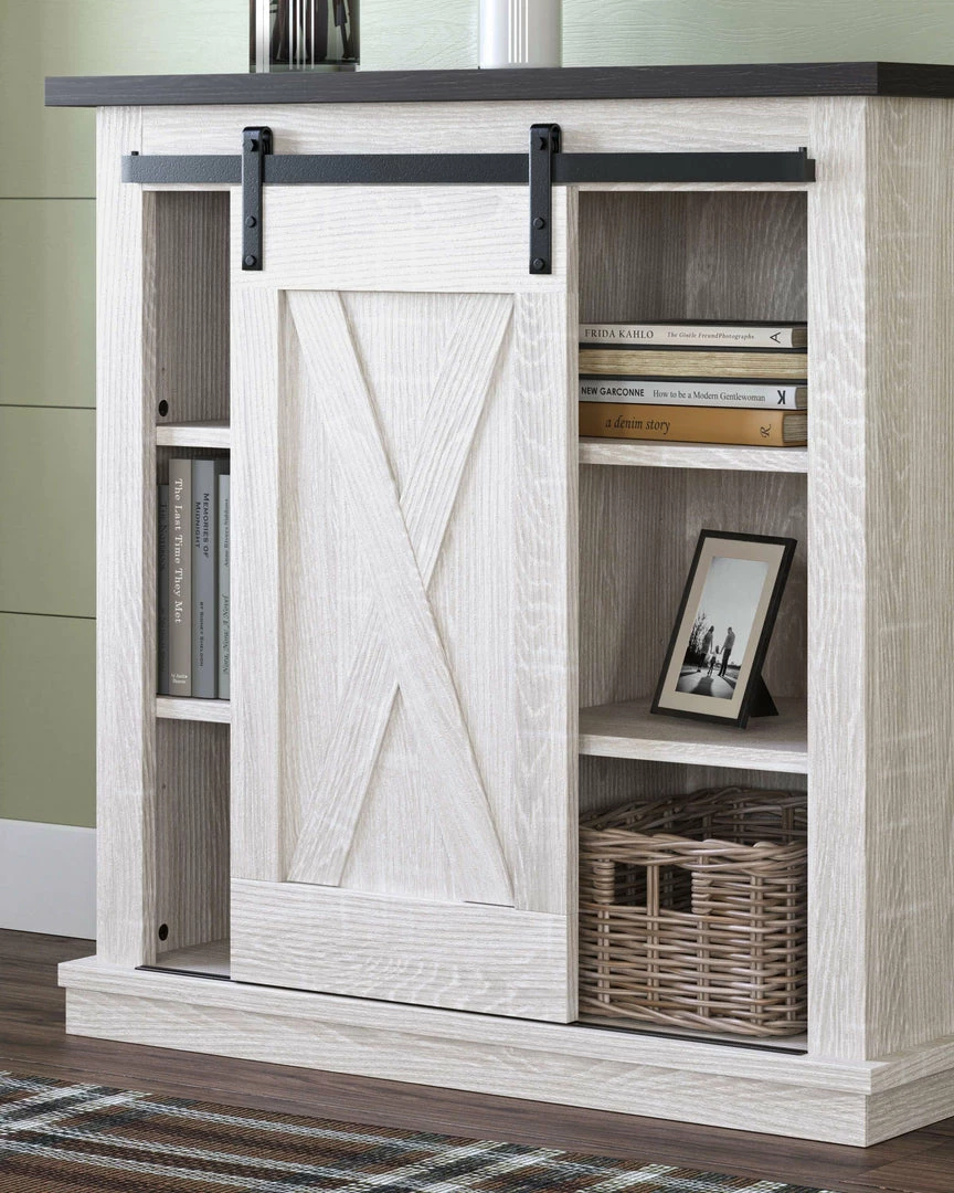 Accent cabinet. Constructed of engineered wood in antique white and gray wood grained effect laminate. Black finished hardware. Cross buck pattern door front. 1 sliding door and 4 adjustable shelves.