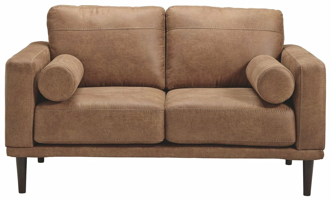 For a fresh spot in your space, turn to this designer loveseat. This invigorating piece breathes warmth into your home with its striking caramel faux leather upholstery and tapered legs. Wind down at the end of a long day when you sink into this canyon of comfort.