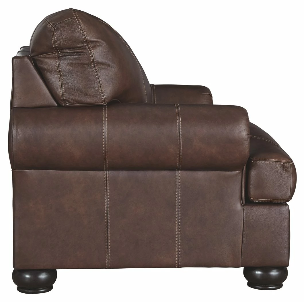 What could be better than the feel of real leather? It’s yours for the taking—at a comfortably affordable price—with this oversized chair. Rest assured, the seating area and armrests are covered in genuine leather for an incomparable experience. Plush roll arms and distinctive details such as box-stitched cushions and prominent bun feet reflect a sense of richly rustic charm that never goes out of style.