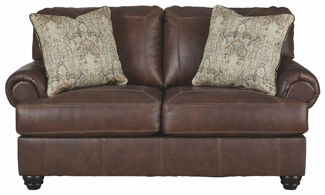 What could be better than the feel of real leather? Itโs yours for the takingโat a comfortably affordable priceโwith this sumptuous loveseat. Rest assured, the seating area and armrests are covered in genuine leather for an incomparable experience. Plush roll arms and distinctive details such as box-stitched cushions and prominent bun feet reflect a sense of richly rustic charm that never goes out of style.