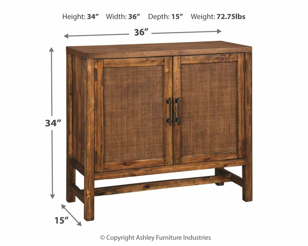Whether youโre going for cool and contemporary or warm and inviting, this accent cabinet is stow enticing. Woven paneled door fronts are elegant yet informal. Beautified with an antique brown finish, this clean-lined accent cabinet easily complements a wide range of decor.