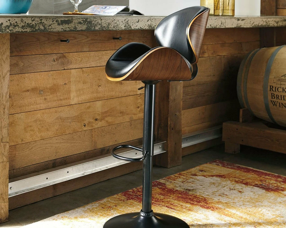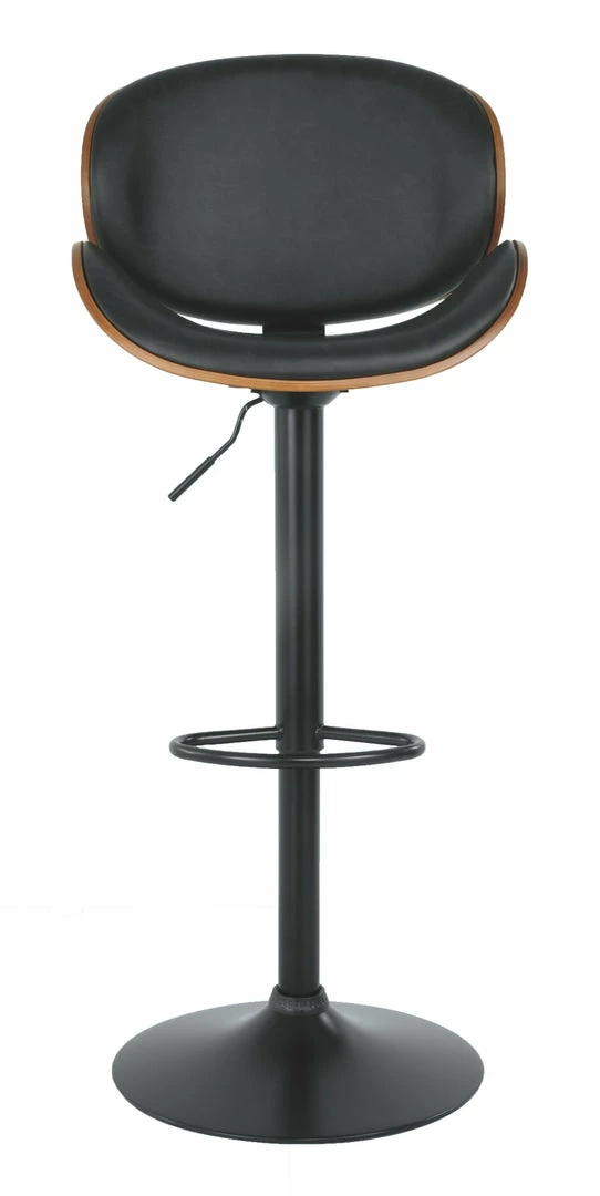 Style takes quite a modern turn. Sporting a distinctively contoured back and seat design, this upholstered swivel bar stool is sure to bring an elevated look to your living space. Wrapped in a black faux leather upholstery, the seating areaโs artful contours are accentuated with a faux wood finish.