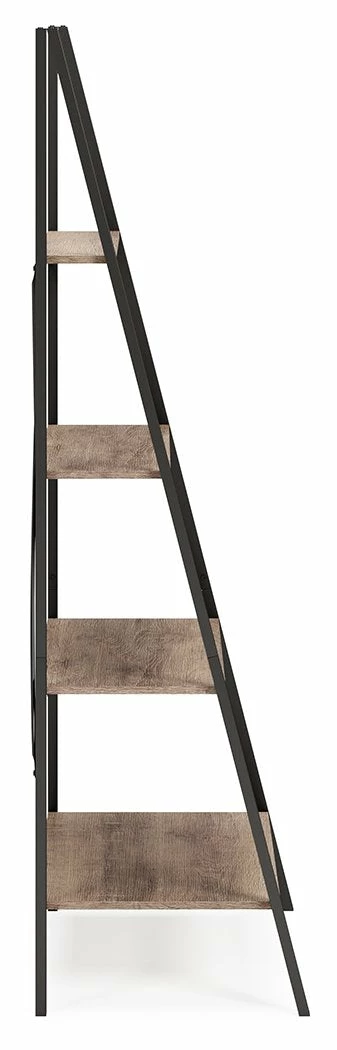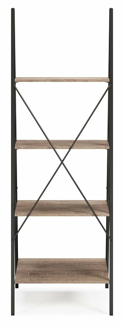 Step up your style with this striking bookcase. Whether for showcasing home accents or housing your collection of books, this brilliantly simple bookcase with four staggered tiers is a mastery in urban casual design. Crafted with a black metal frame with cross-braced styling and engineered wood shelves beautified with a grayish brown decorative wood grain laminate, this open-concept bookcase merges a cool look with a warm feel. Use as a single bookcase or combine two or more for a bunching wall.