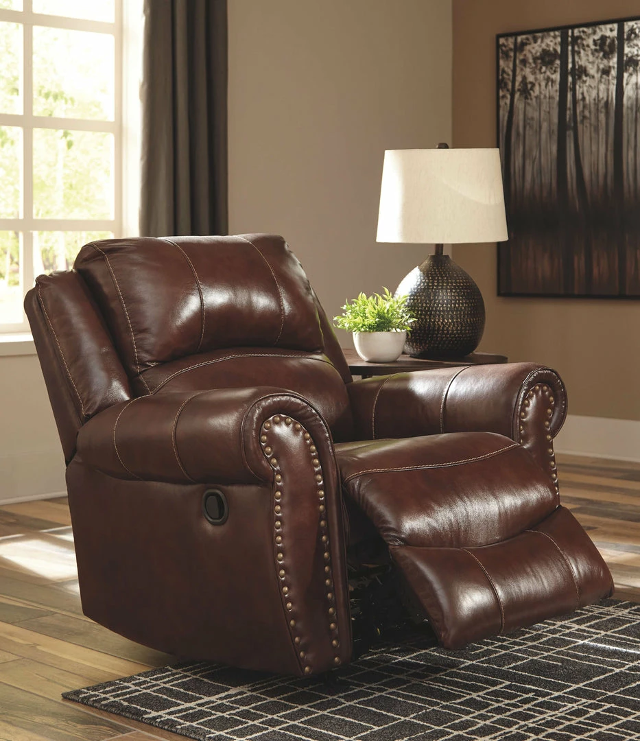 Merging the handsome, stately looks of an armchair with kickback comfort from head to toe, this rocker recliner rocks on so many levels. Rest assured, this recliner’s seating area is wrapped in top-grain leather for your pleasure. Skillfully matched upholstery everywhere keeps the price well within reason. The recliner’s roll arm profile punctuated with oversized nailhead trim is an easy complement for contemporary and classic decor.