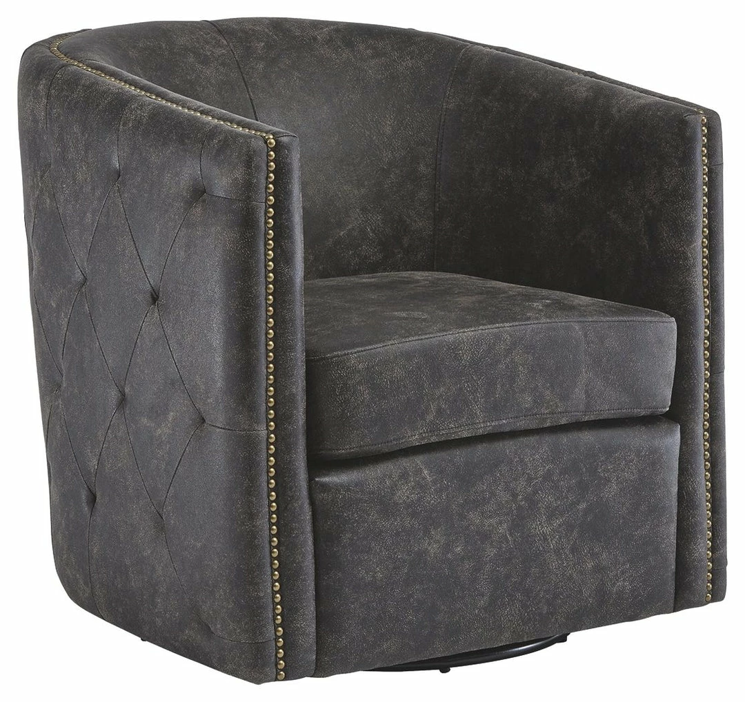 Classic style gets an urban upgrade in this cool accent chair. The barrel back and tufted sides evoke swanky private clubs while the distressed black faux leather keeps it current.