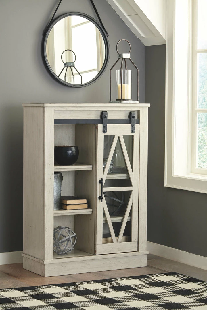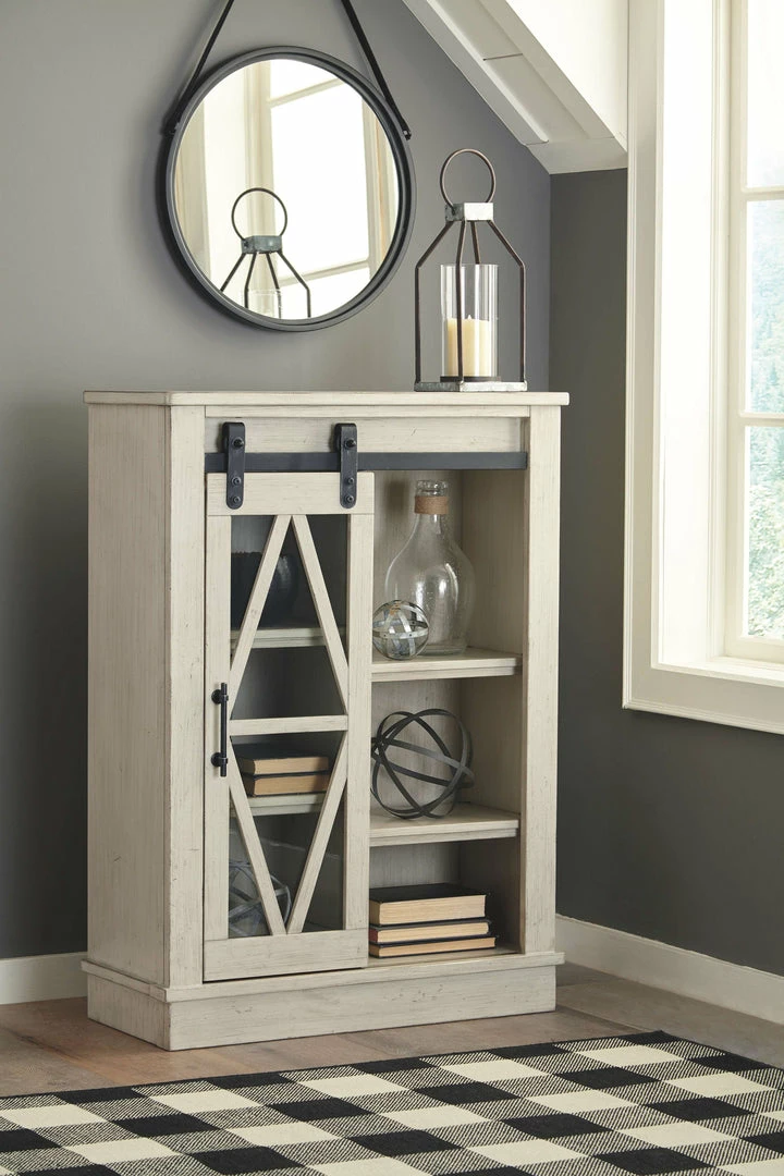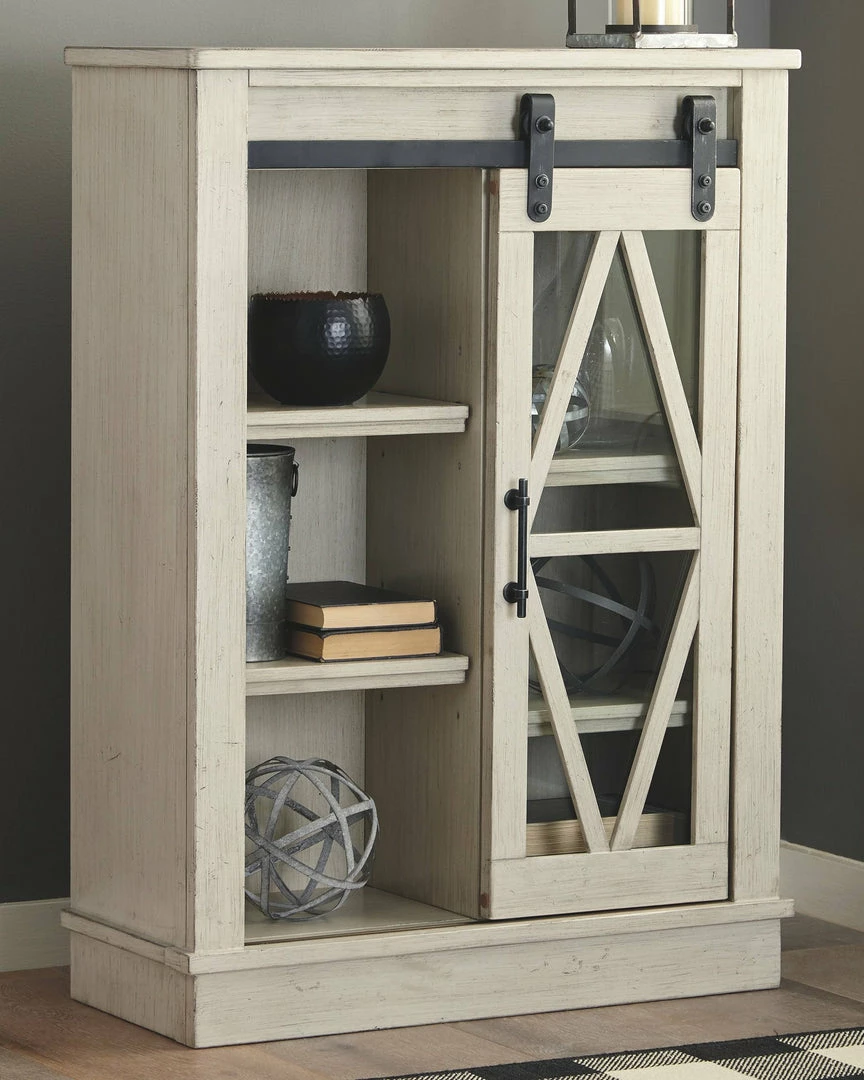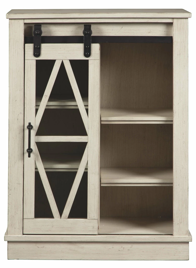 Put your love of modern farmhouse living on display with this accent cabinet. Antique white finish and sliding “barn door” make it loaded with character. Four adjustable shelves are packed with potential.