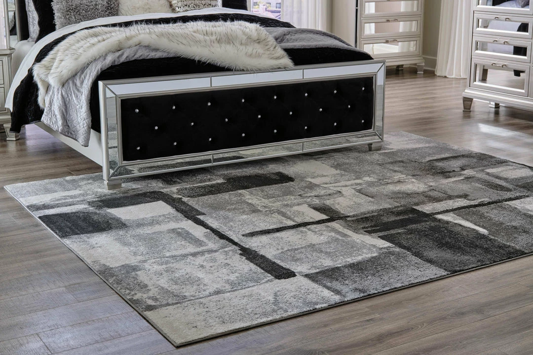 This area rug features a striking abstract design in black, gray and cream. Its ethereal look dresses up a room with subtle color, visual texture and a highly contemporary point of view.