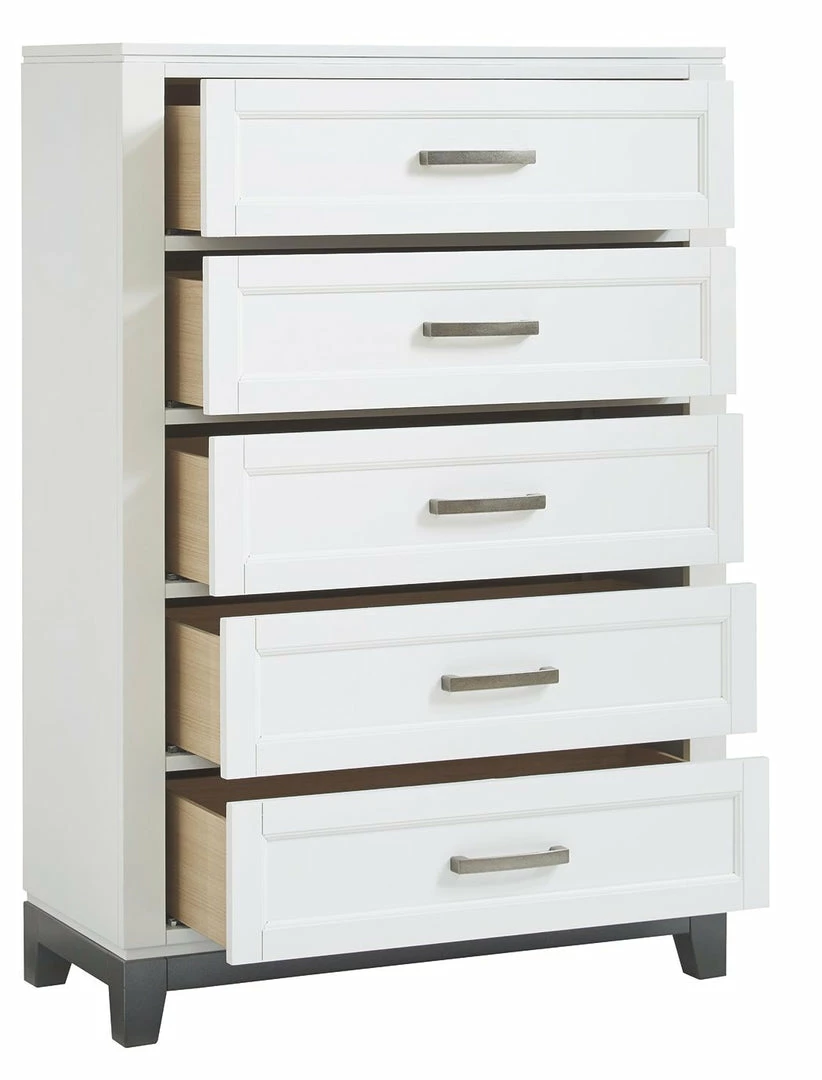 If you love that touch of vintage charm, but want something with a contemporary edge, this chest of drawers suits your style beautifully. Crisp white finish and floating top design paint a pretty picture. Shaker style drawer fronts, satin nickel-tone knobs and contrasting steel colored base complete the aesthetic.