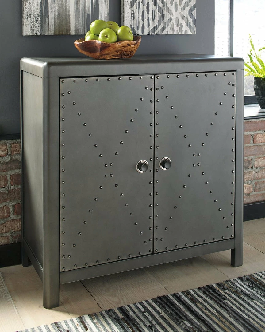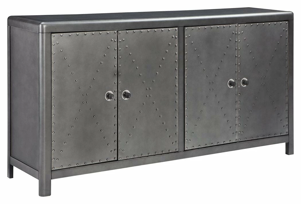 Whether storing plates and linens in the dining room, supplies in the home office or serving as a TV console, this 4-door accent cabinet works a modern industrial look loaded with versatility. Antique gunmetal finish’punctuated with nailhead accents’wows with retro-chic charm.