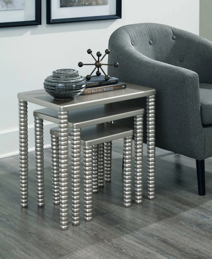 The perfect addition to any home, this 3-piece table set, with uniquely designed cork screw legs, includes three different sizes of contemporary, champagne finished nesting tables. Space-saving nesting design is a smart choice on so many levels.