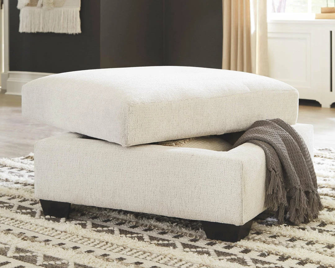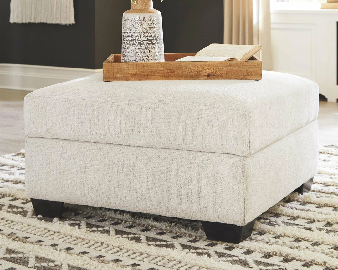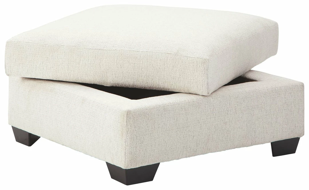 Let it snow. Doubling your pleasure with its combination of form and function, this storage ottoman in a snow-tone chenille fabric invites you to stretch your style in an easy-elegant way. Whether your aesthetic is urban hip or suburban chic, this posh ottoman with removable cushioned top and loads of handy storage is sure to look and feel right at home. And how’s this for a welcome surprise: a built-in tabletop with cup holders on the flip side!