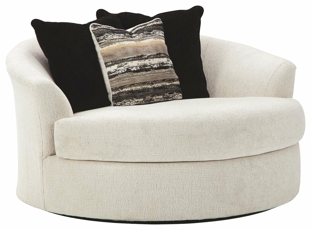 Let it snow. Doubling your pleasure with a spacious seating area with room for two—or just you—this oversized round swivel chair in a snow-tone neutral invites you to stretch your style in an easy-elegant way. Whether your aesthetic is urban hip or suburban chic, this posh swivel chair is sure to look and feel right at home. Wrapped in a chunky heavyweight chenille fabric with a delightful touch, this fashion-forward chair includes designer pillows for a brilliant pop of color and texture.