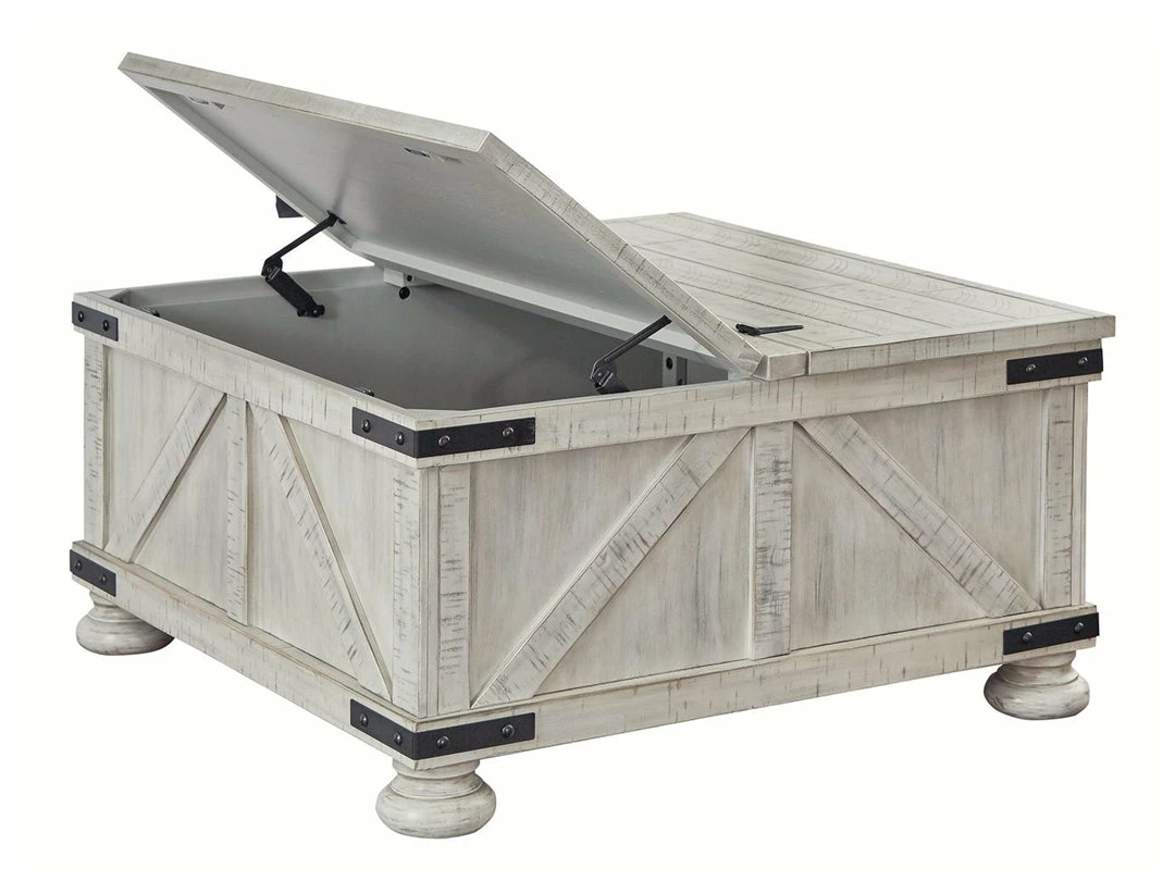 Double up on form and function with this square coffee table with storage. Its dual-lid tabletop provides easy access to the roomy storage space. Crafted with a distressed whitewash finish, crossbuck detailing and metal bracket appliques, this generously scaled coffee table is rustic farmhouse living at its best.