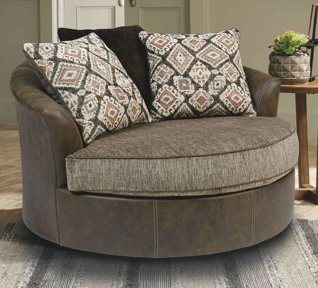 They say you canโt have it both ways. This indulgently styled oversized swivel accent chair begs to differ. Merging cool looks with a warm, cozy feel, this decidedly modern chair is the ultimate compromise. The chairโs heavy-duty faux leather is enriched with a weathered treatment and contrast stitching. Rest assured, a spacious cushion wrapped in plush chenille provides an oh-so comfortable feel where it really counts. Designer throw pillows take the aesthetic to another level.