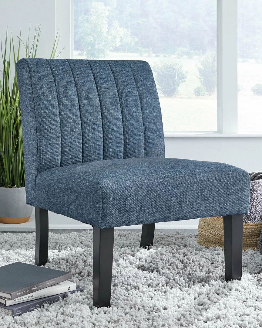 This fashion-forward accent chair adds a cool vibe to your home. The armless design and channel stitched back is perfect for living spaces that need a spark of excitement. Bringing just enough pizazz to liven a space in a fresh, contemporary way, this accent chair is an especially smart choice for small spaces.