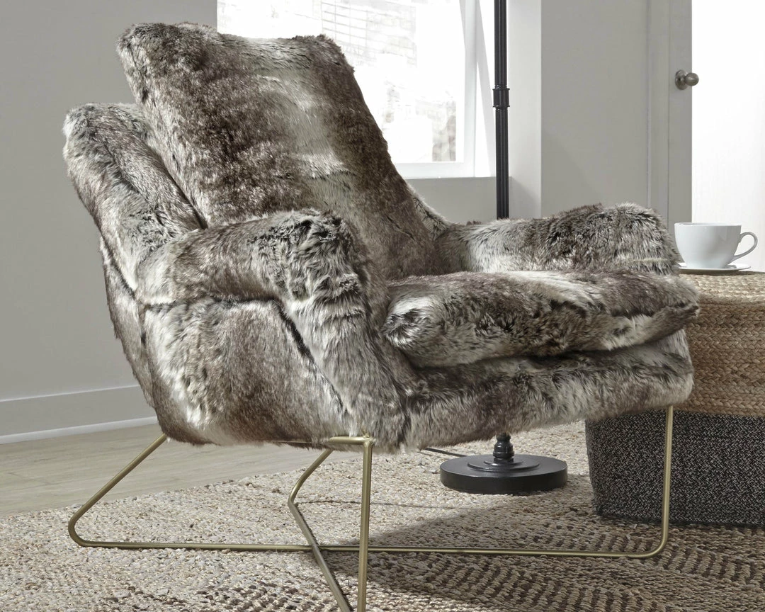 Taking cues from Scandinavian design, this contemporary accent chair welcomes you with open arms. Faux fur seat in shades of gray adds a layer of warmth and texture. Metal base is minimalistic in design but big on support. Grab a throw and cozy up.