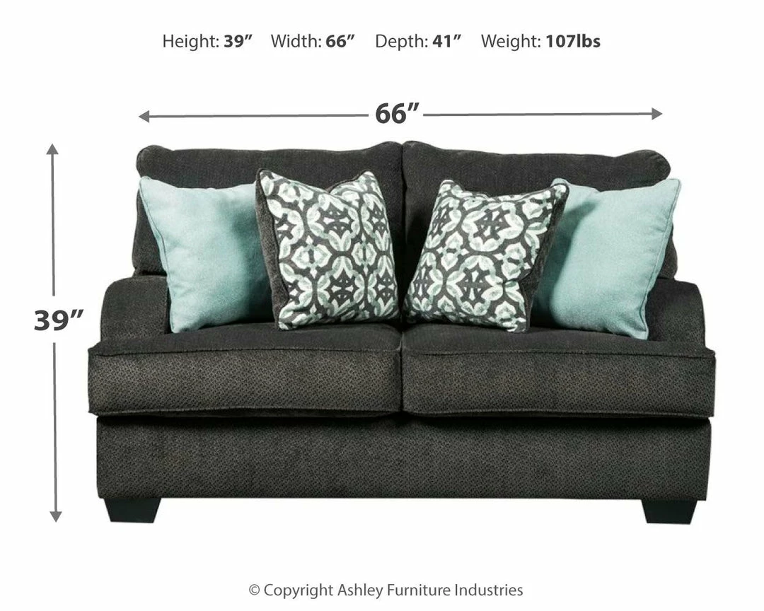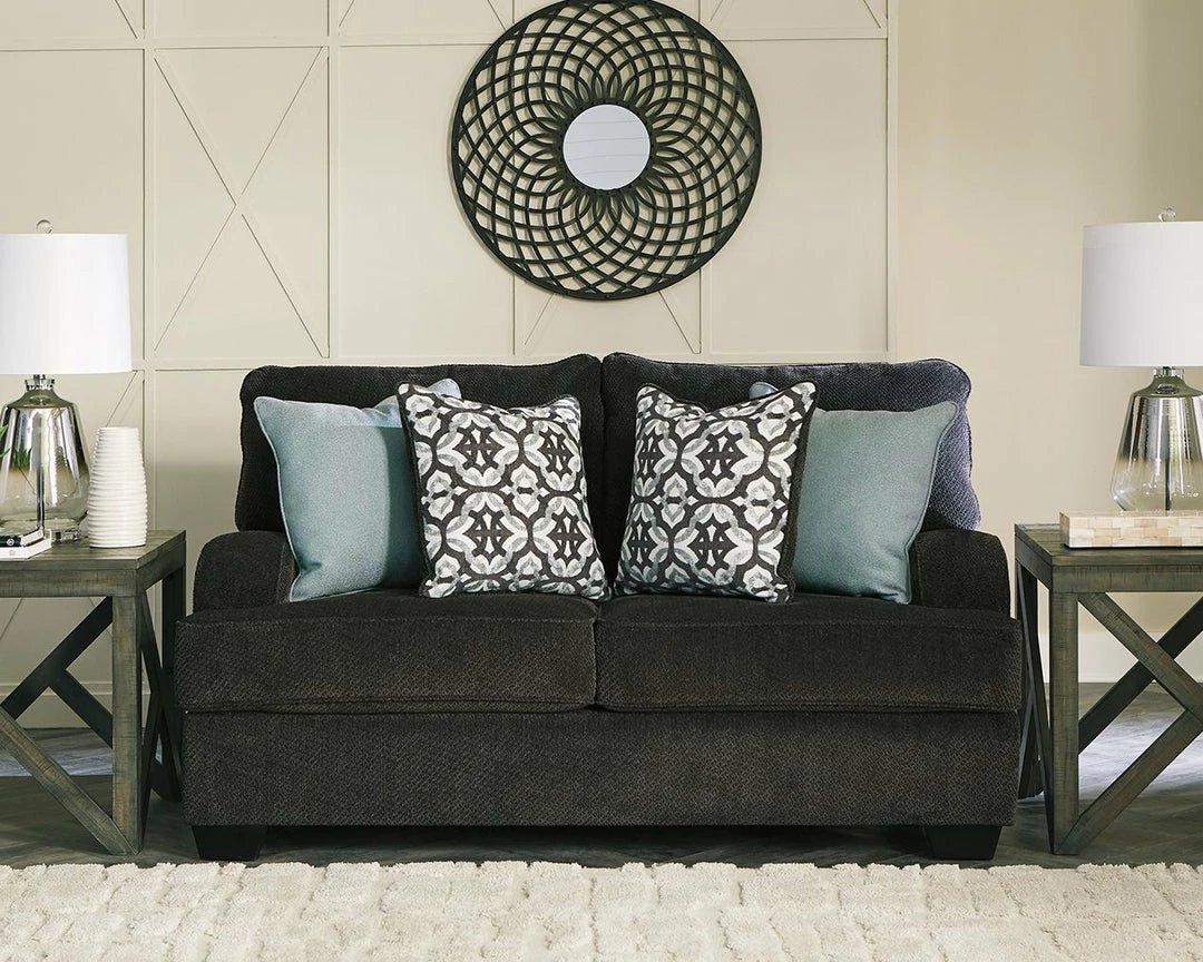 Wrapped in a decadently plush charcoal fabric, this tempting loveseatโwith roll back arms for distinctive flairโis so easy to fall for. Adding to the feel-good experience: four toss pillows that bring tone, texture and comfort to the scene.
