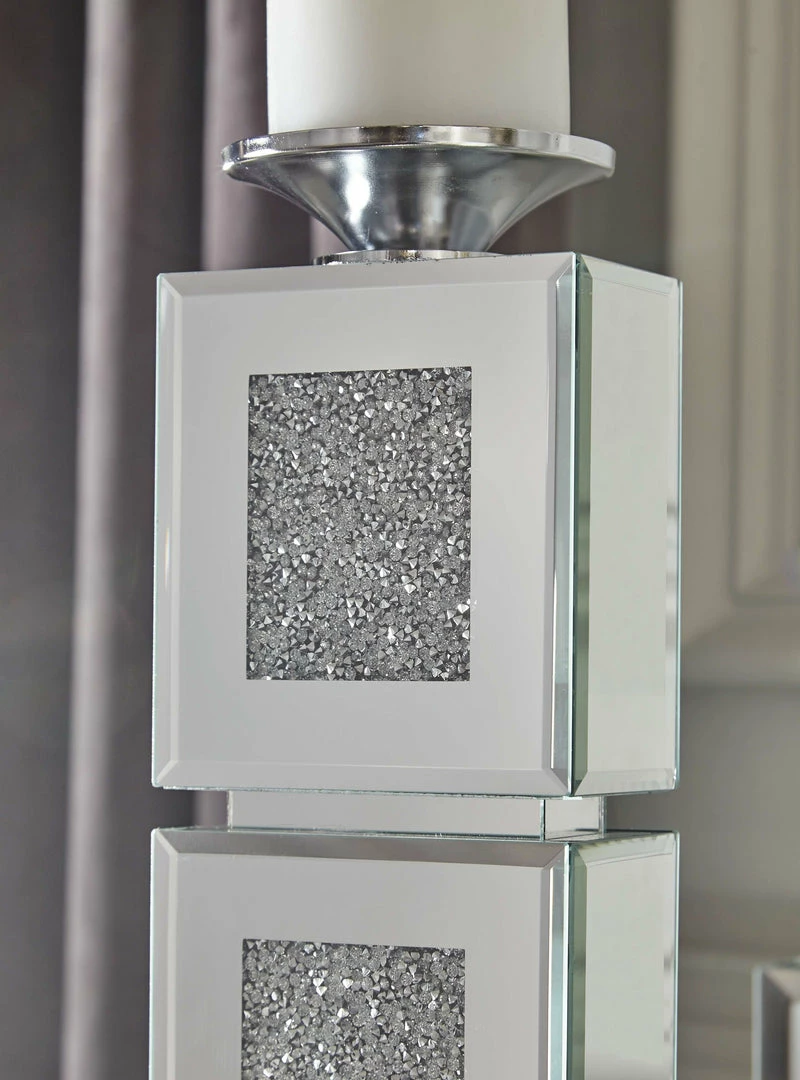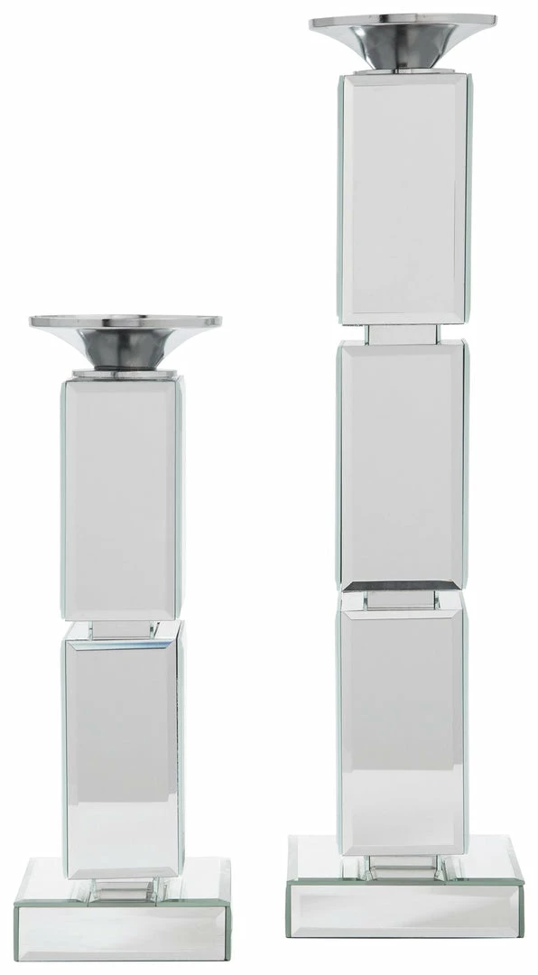 Add a touch of glamour to your accent table or mantle with this candle holder set. The cut-glass mirror base embellished with silvertone beaded accents will keep the candlelight dancing for hours.