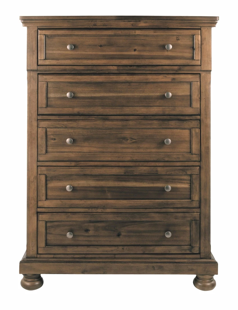 A fresh, new take on traditional style. This chest of drawers meets today’s design tastes with beauty and grace. Its tobacco brown finish allows the natural grain of the acacia veneers to show through in an organic way. Aged brass-tone knobs dress the fronts of the roomy drawers. A hidden pull-out tray behind the top middle drawer puts your small valuables out of sight. This is a look you can appreciate for years to come.