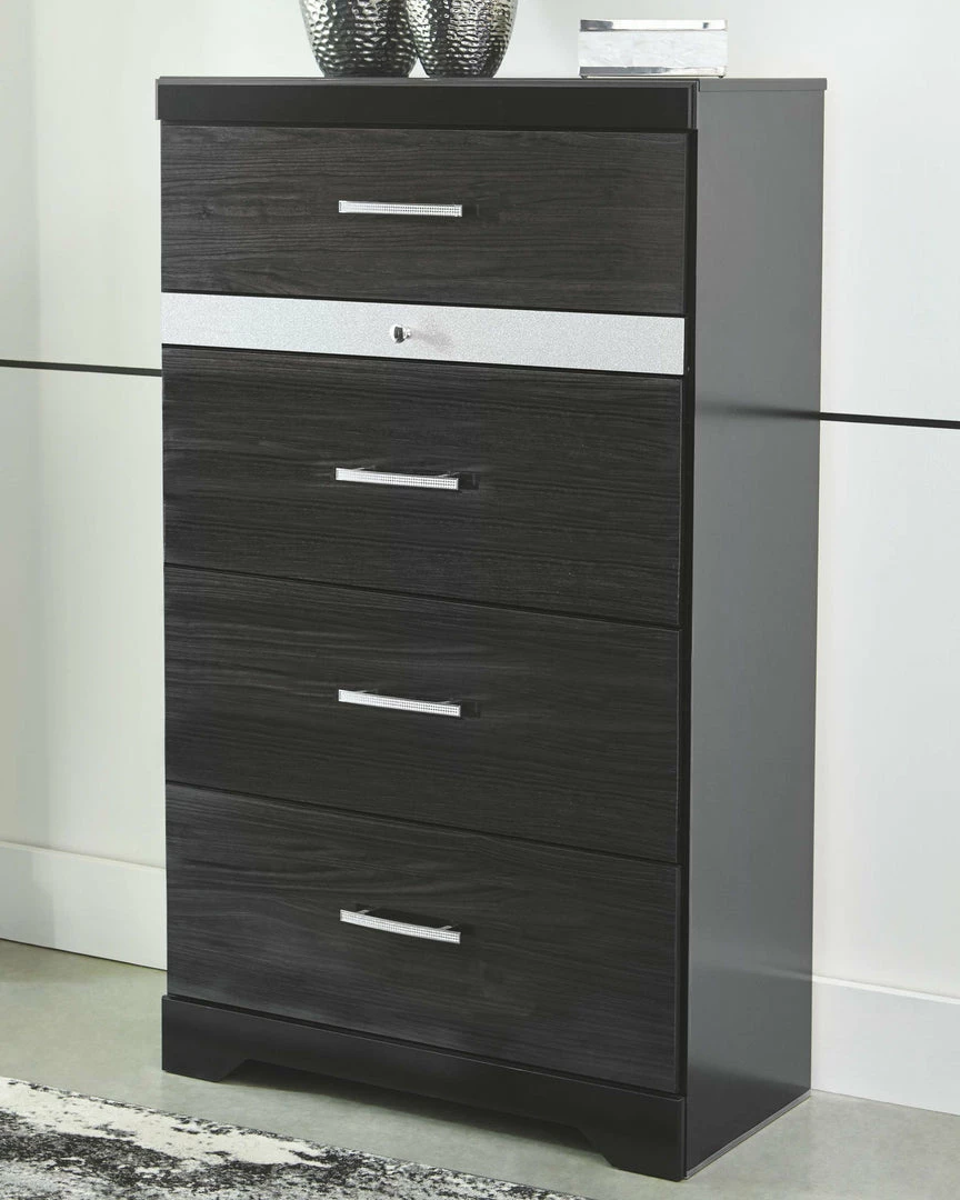 Starry, starry nights. Inspired by Hollywood glam, this richly styled chest of drawers steals the show in a simply stunning way. Its replicated walnut grain is enriched with a high-gloss black finish, made even more dramatic with chrome handles with faux crystals. A felt-bottom six-compartment jewelry drawer with silver glitter finish front accentuates the clean-lined, contemporary aesthetic.