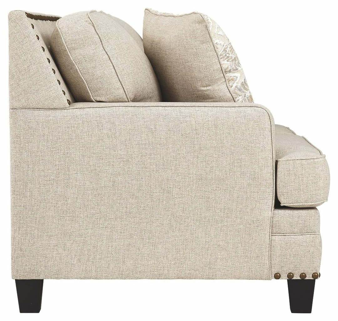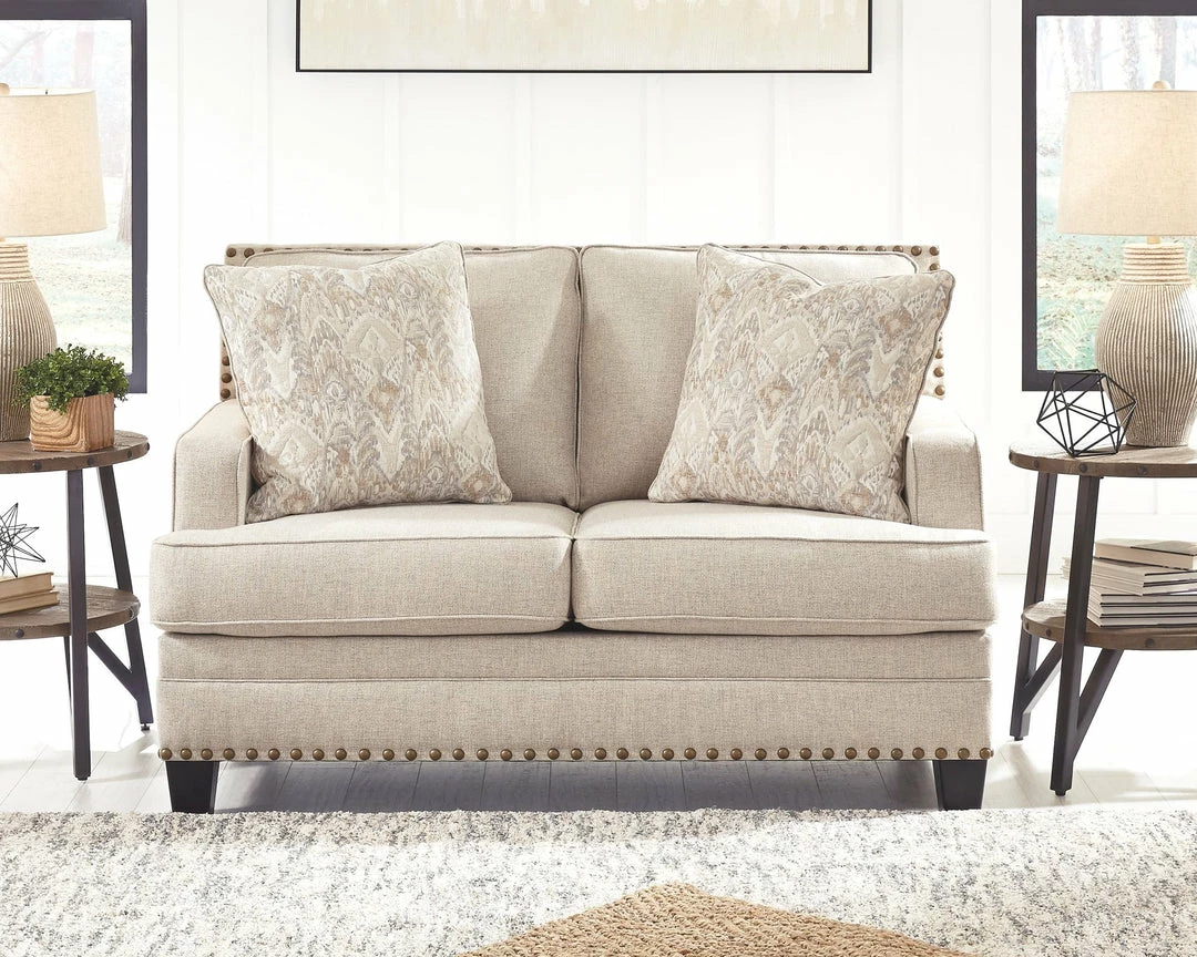 A case of contemporary and classic style influences coming together in a beautiful way, this loveseat in beige brings a fresh perspective to modern farmhouse living. Distinctive elements include t-cushions that wrap around setback track arms, nailhead trim and a lovely linen-weave upholstery for an up-to-date feel. Muted hue designer throw pillows master the art of subtlety.